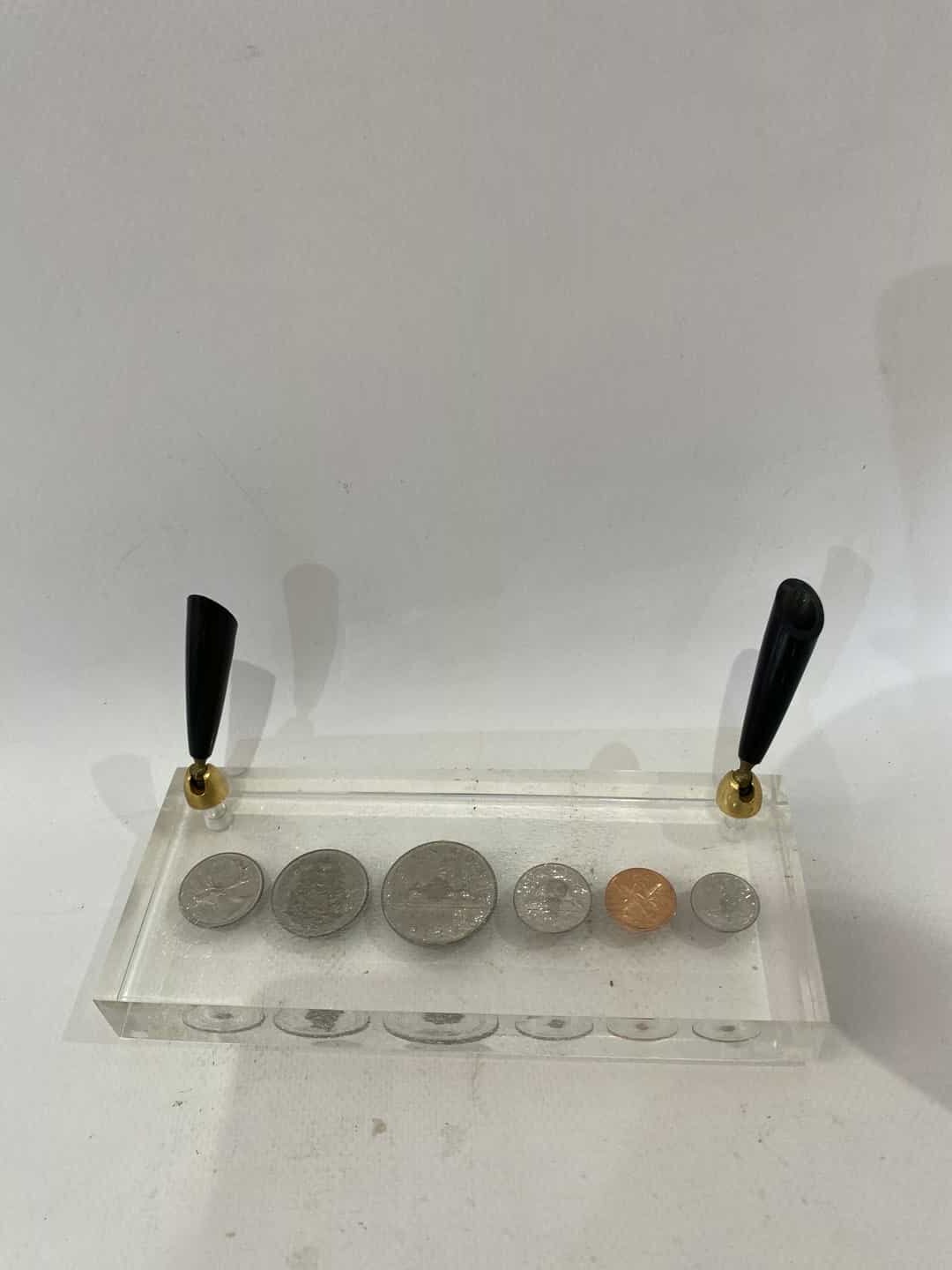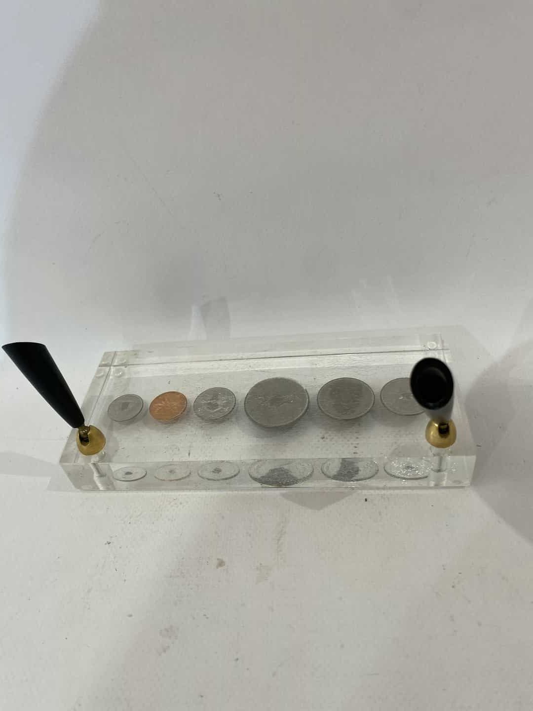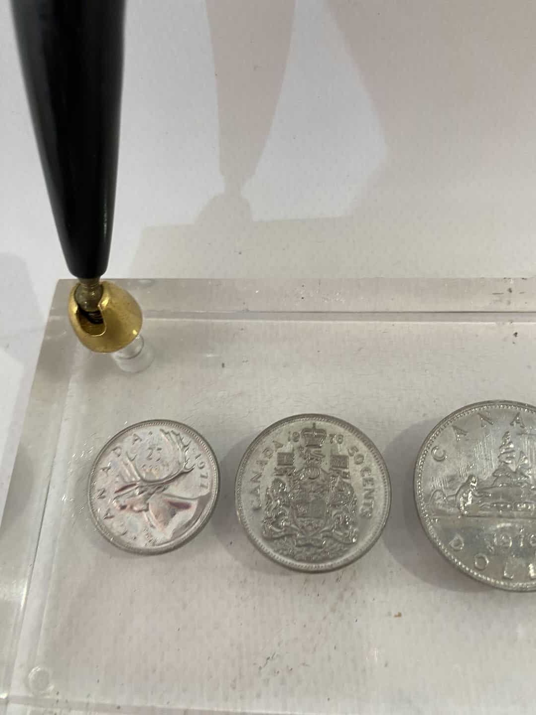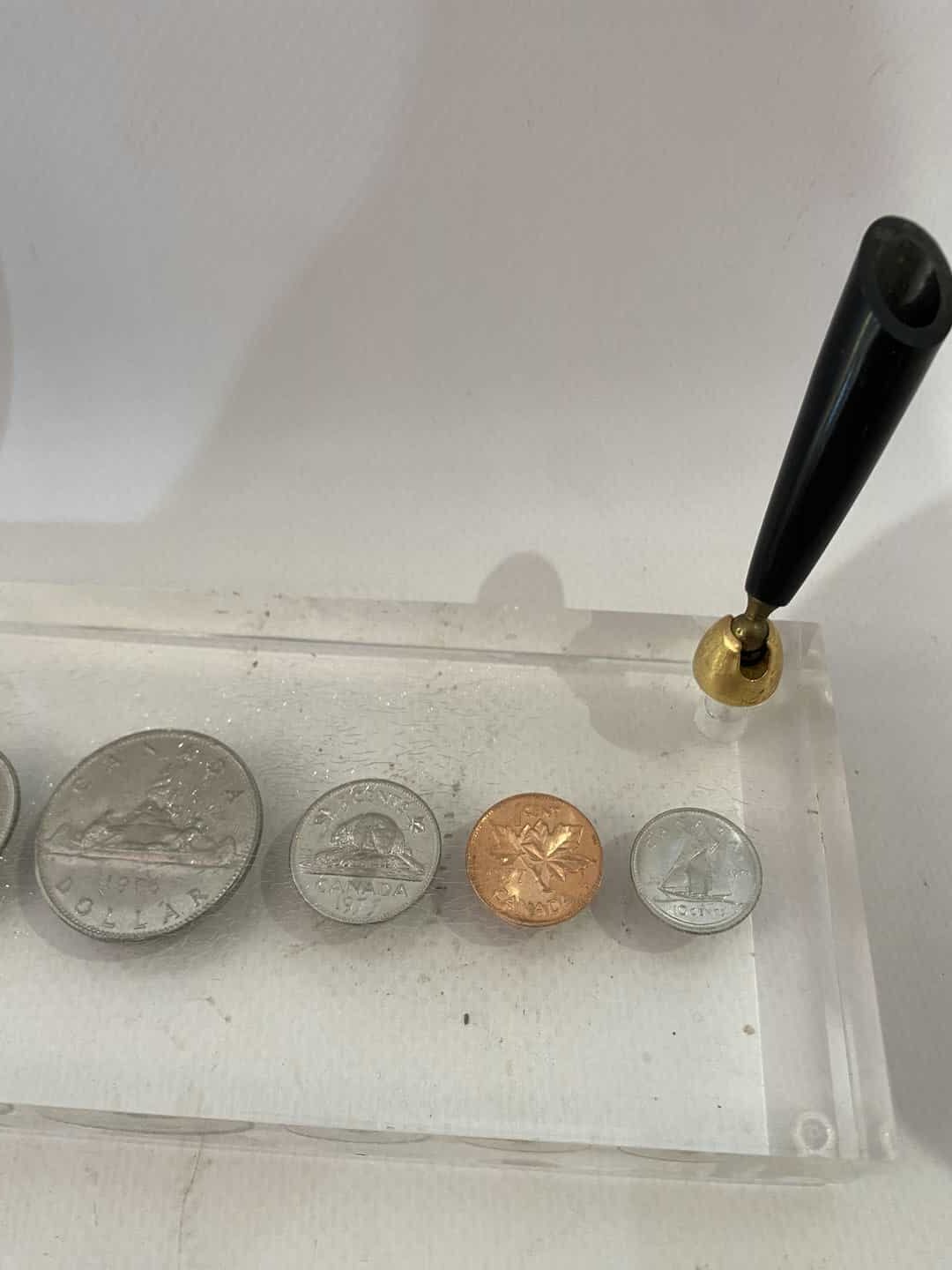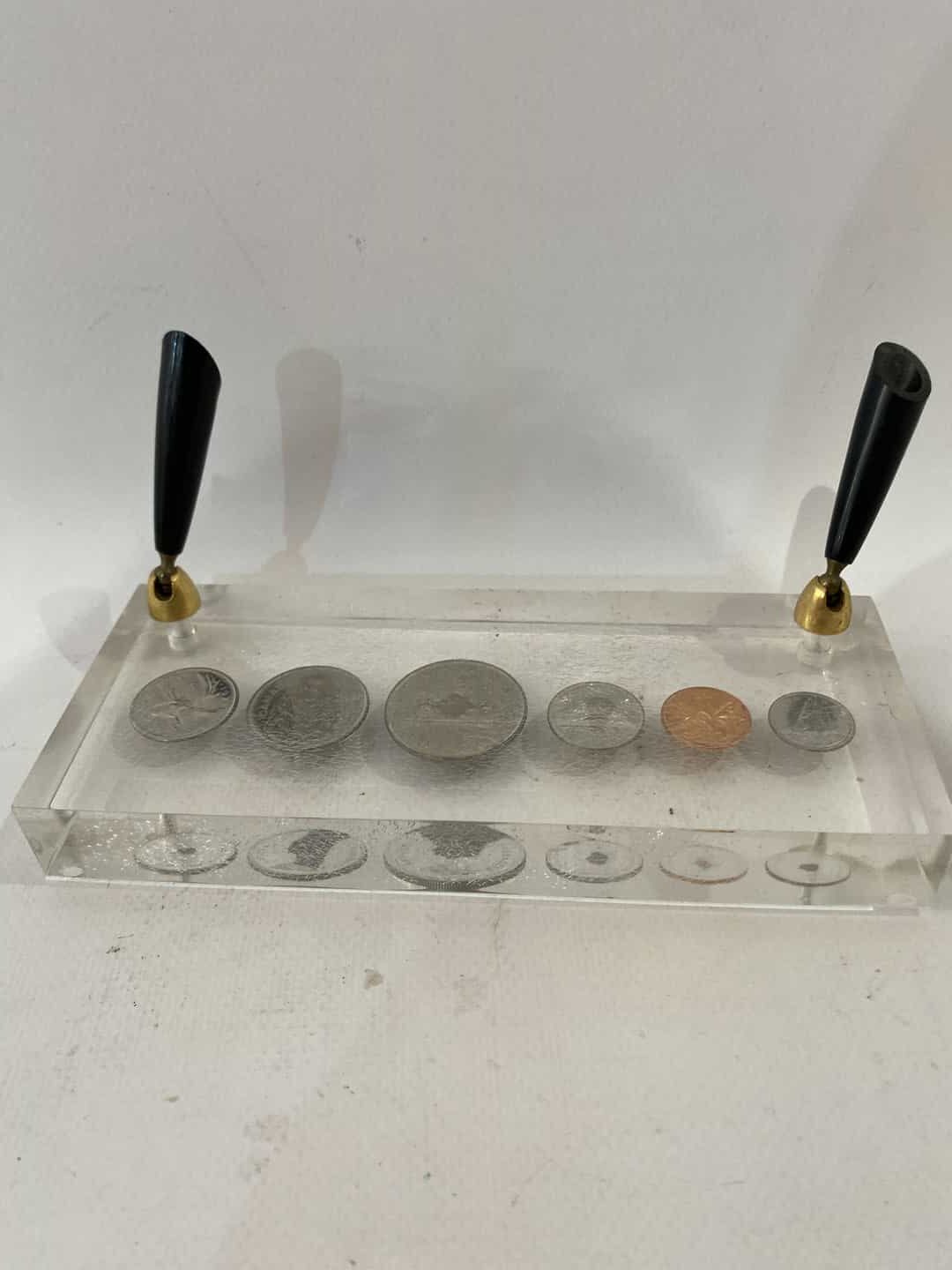 Αντίκα διακοσμητικό γραφείου με νομίσματα Καναδά και θέσεις για στυλό-πένα 9x7x18