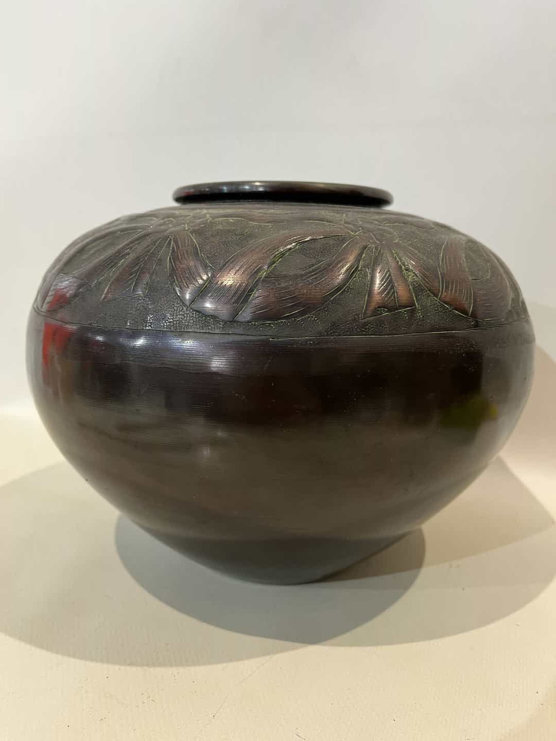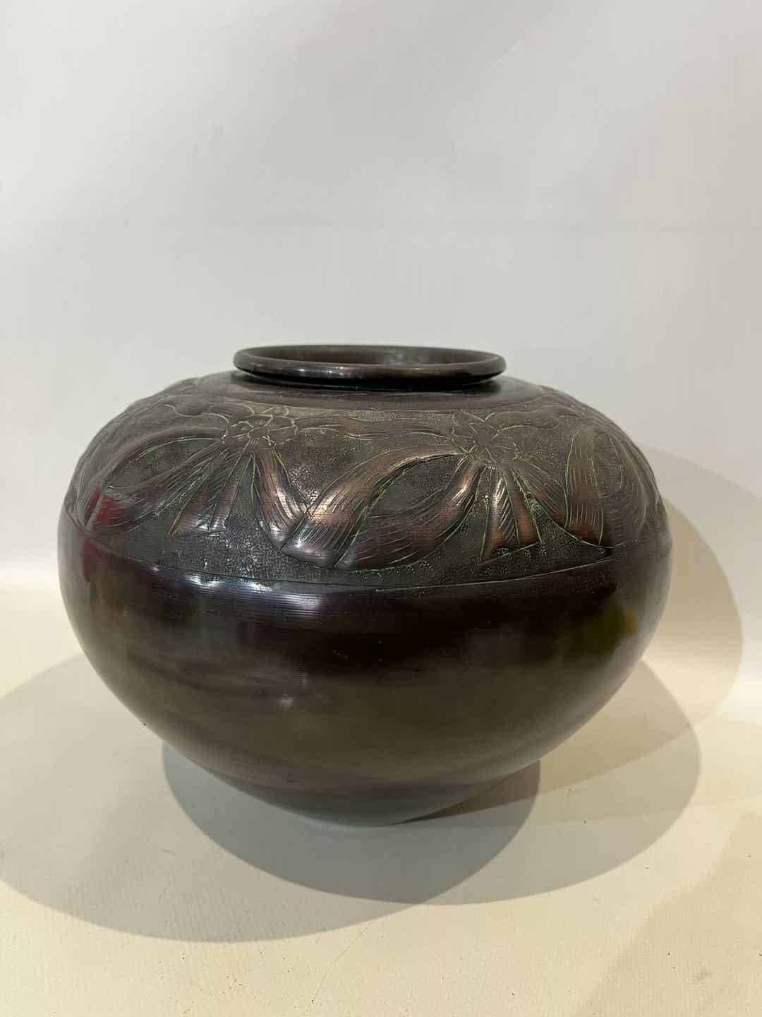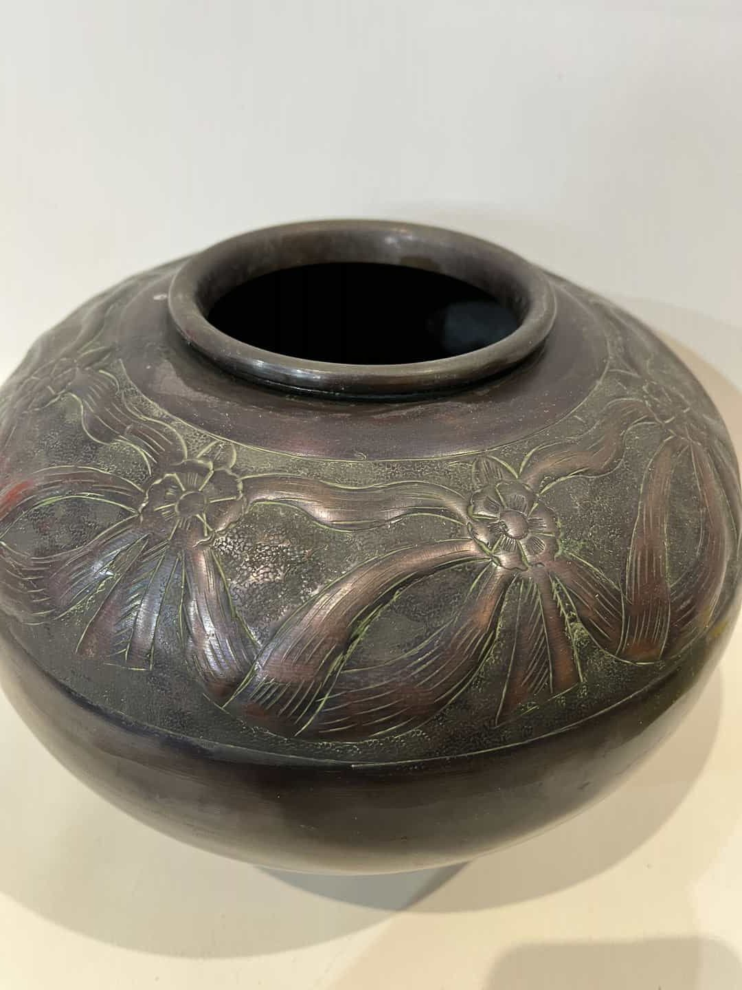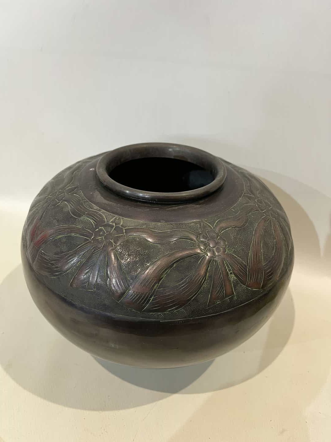 Αντίκα χάλκινο βάζο με ανάγλυφη διακόσμηση φιόγκων 20×21 Κωδικός προϊόντος: #s15701
