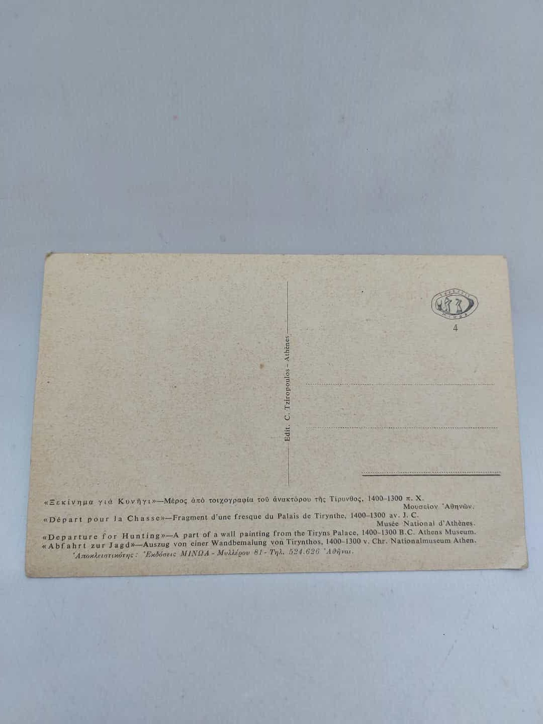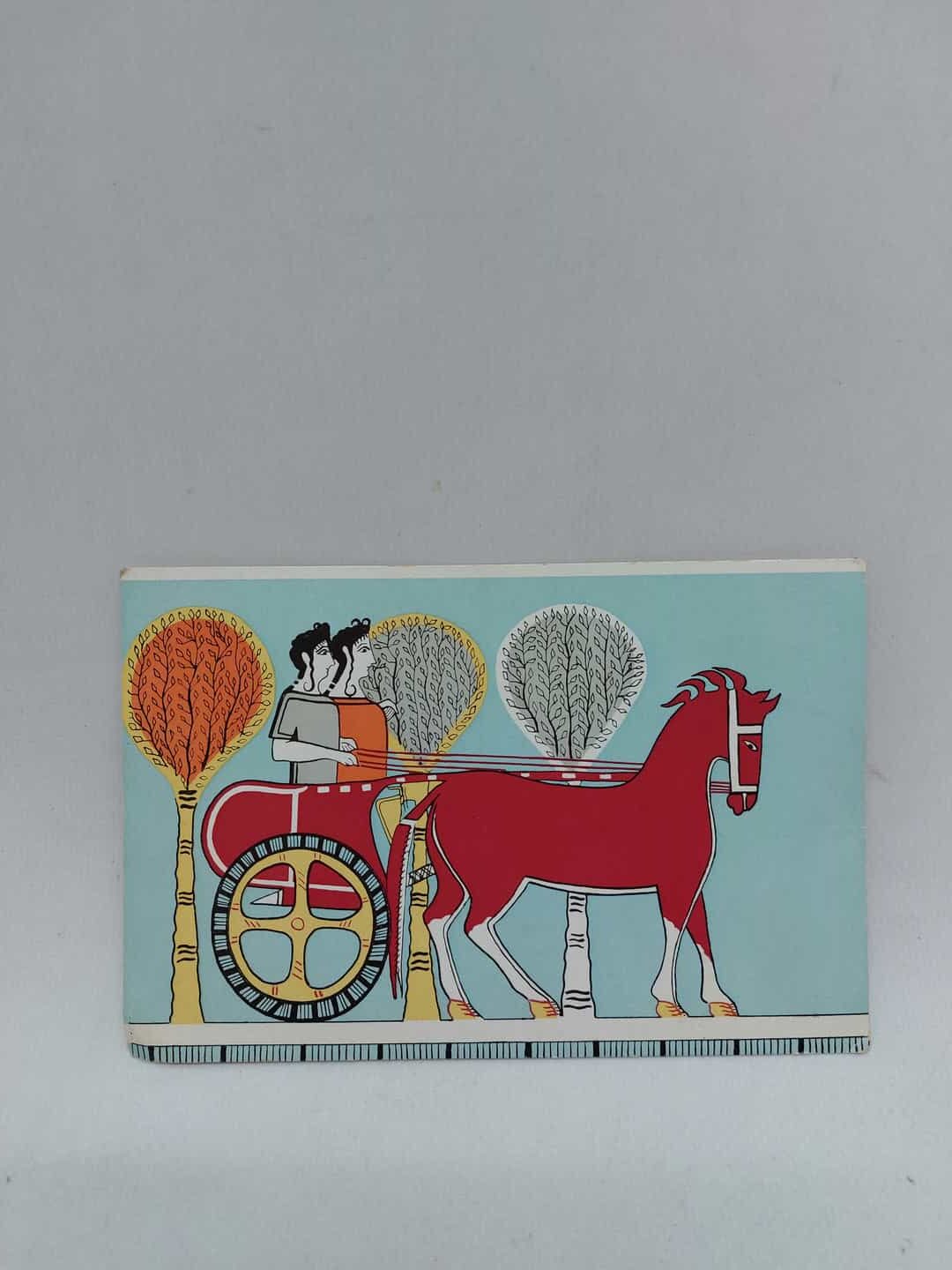 Κάρτα που απεικονίζει 2 γυναίκες σε άρμα  που πάνε για κυνήγι στο δάσος. Μέρος από τοιχογραφία του ανακτόρου της Τίρυνθας 10,5×15,5cm Κωδικός προϊόντος: #s7313