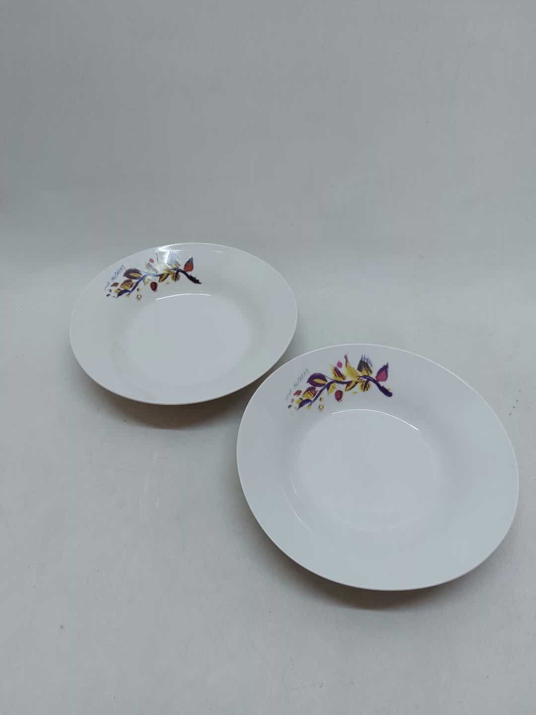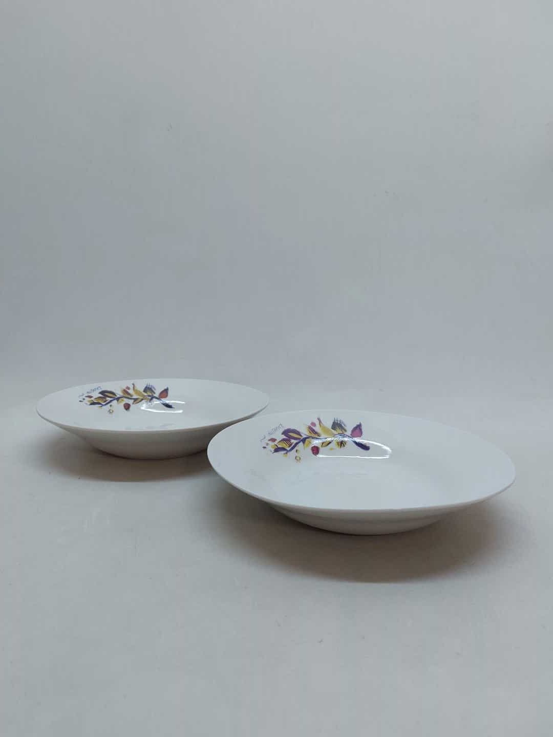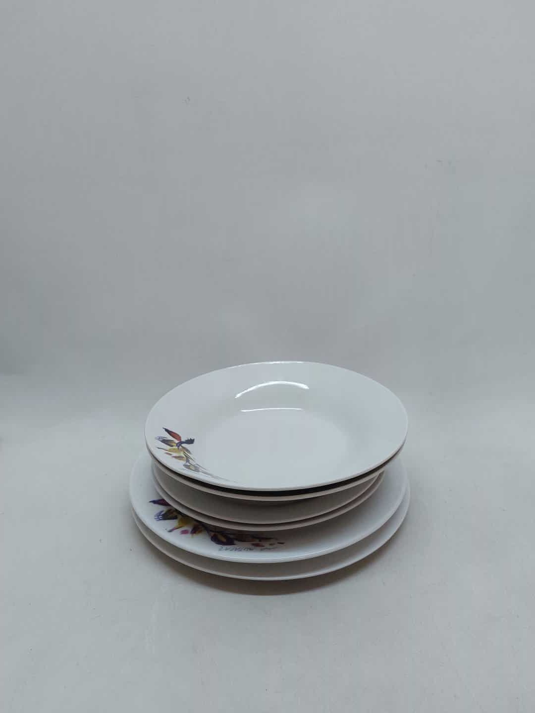 Πορσελάνινο σετ σερβιρίσματος 6 τεμαχίων με την υπογραφή Μυταράς. Αποτελείται από 2 μεγάλα ρηχά πιάτα 23cm( δεν είναι ακριβώς ολόιδια, το ένα είναι είναι λίγο πιο φλατ/ίσιο, αλλά δεν φαίνεται η διαφορά αν δεν το προσέξεις), 2 μικρά ρηχά πιάτα 18,5cm και 2 βαθιά 4x20cm Κωδικός προϊόντος: #s7842