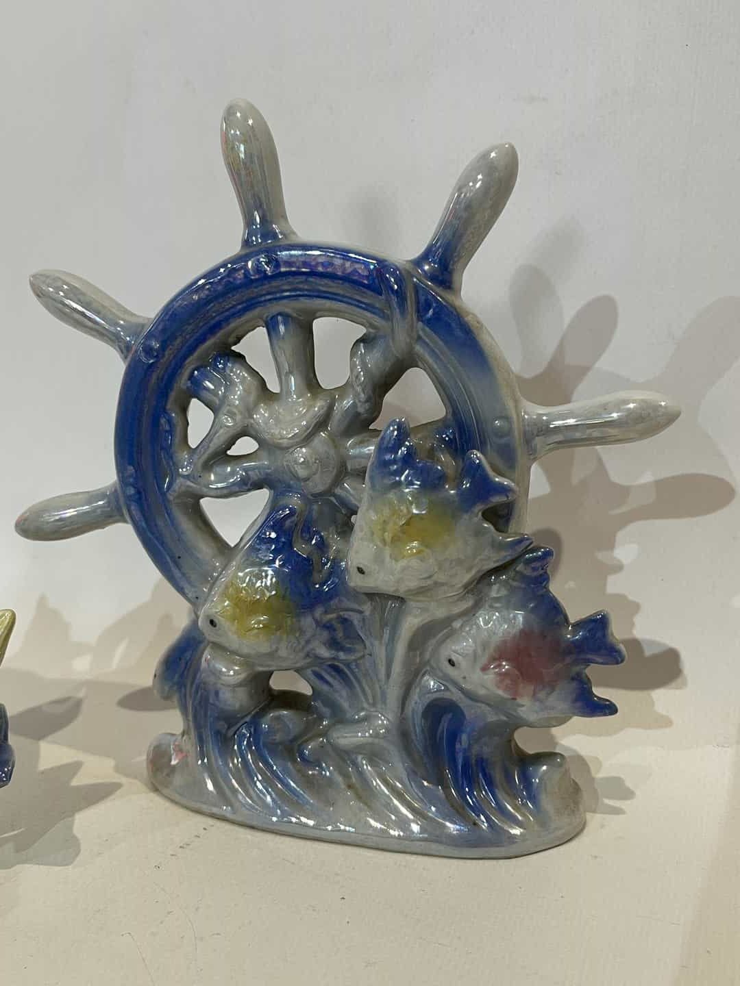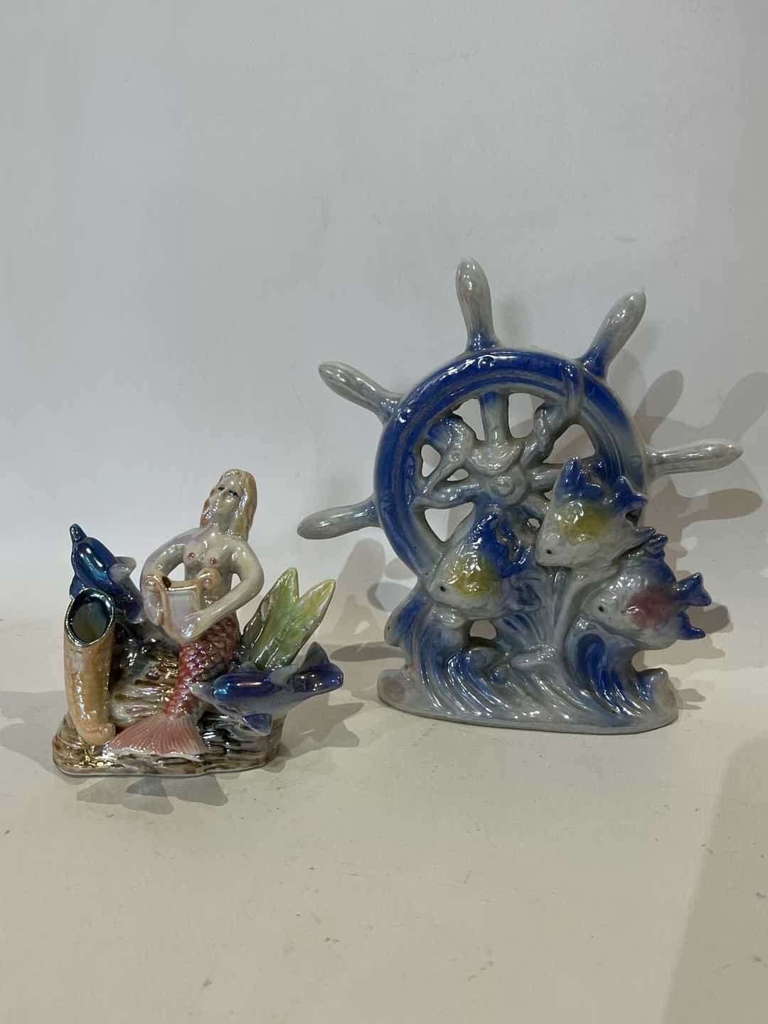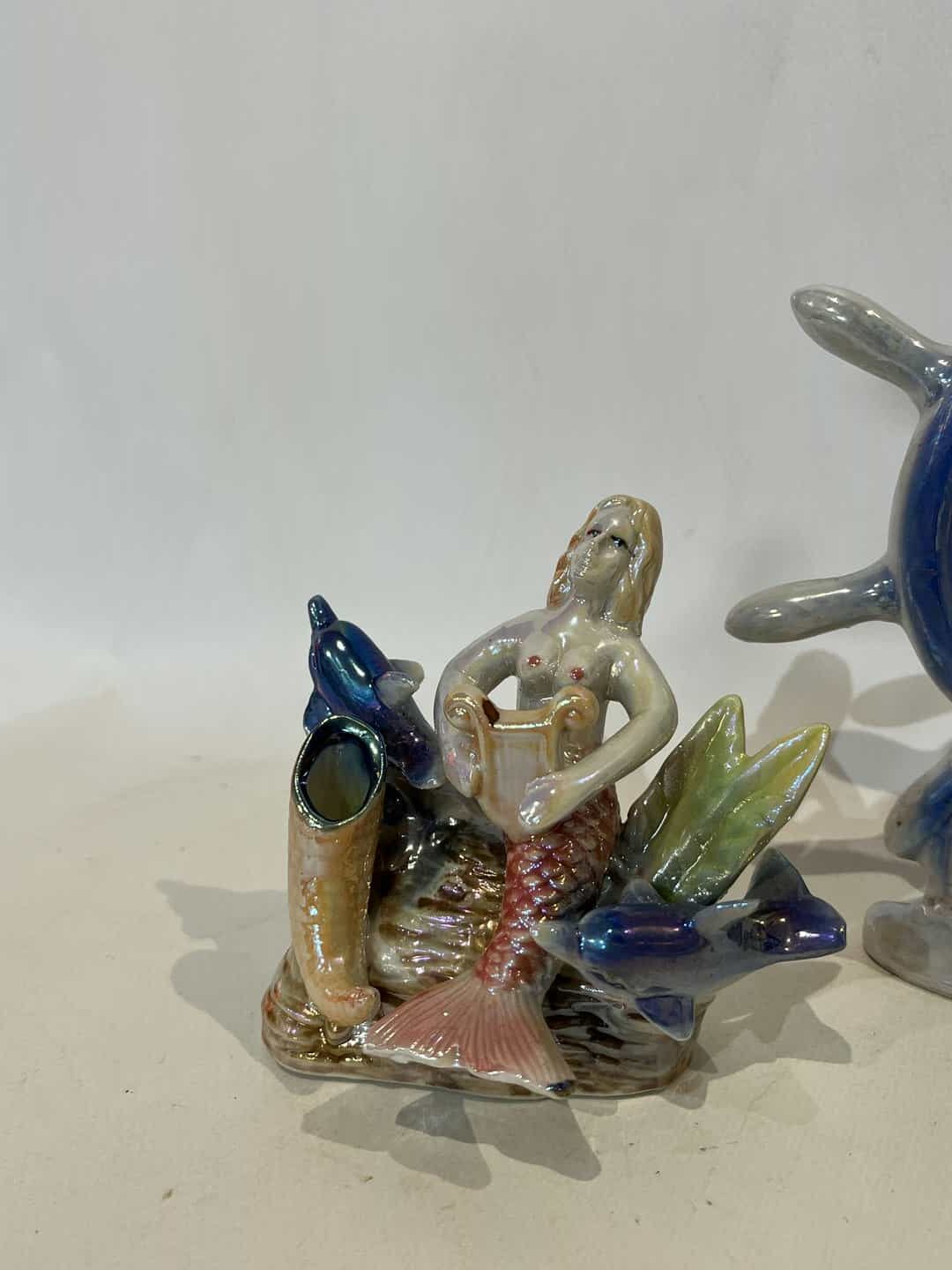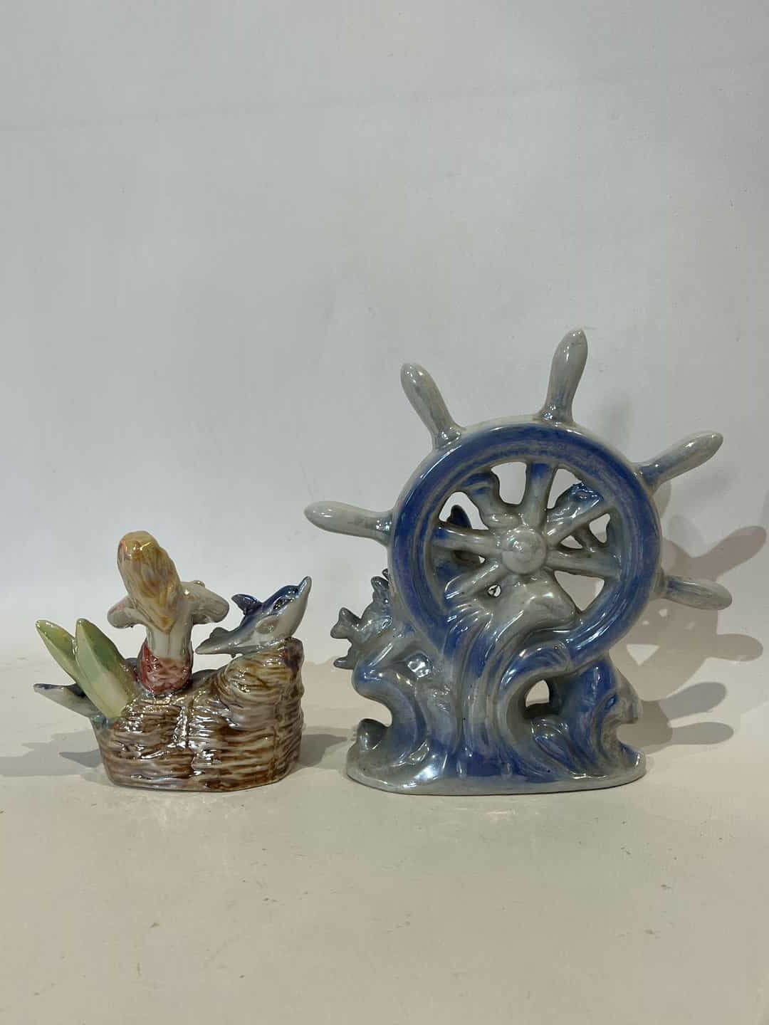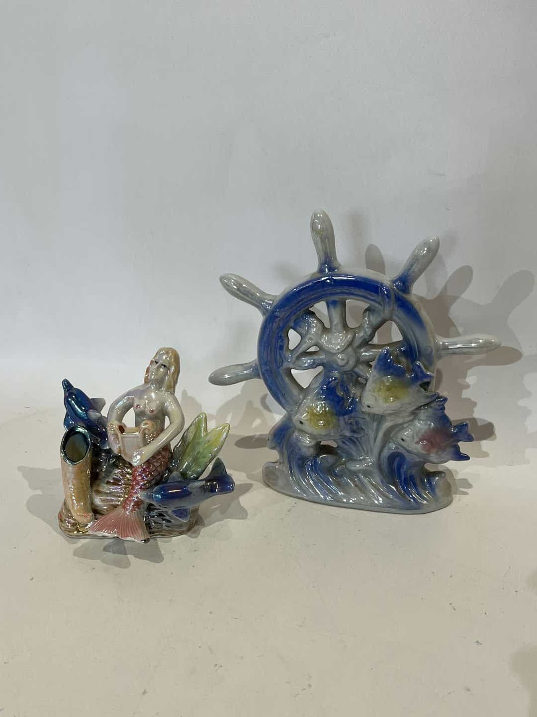 Σετ 2 κεραμικές επιτραπέζιες φιγούρες με ιριδίζον χρώματα . Διαστάσεις γοργόνα: 9x10x5 , τιμόνι καραβιού: 17×16 Κωδικός προϊόντος: #s14545