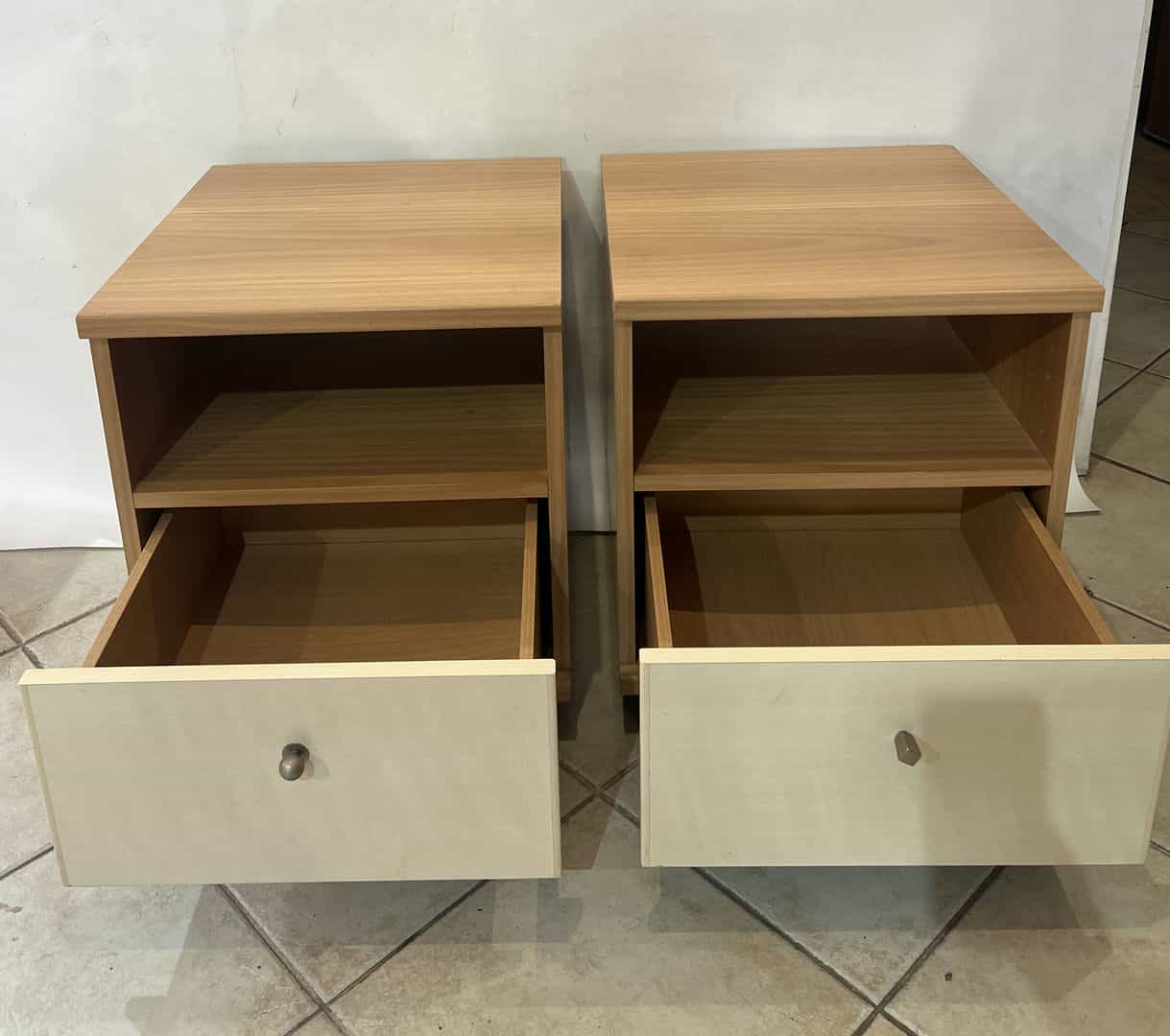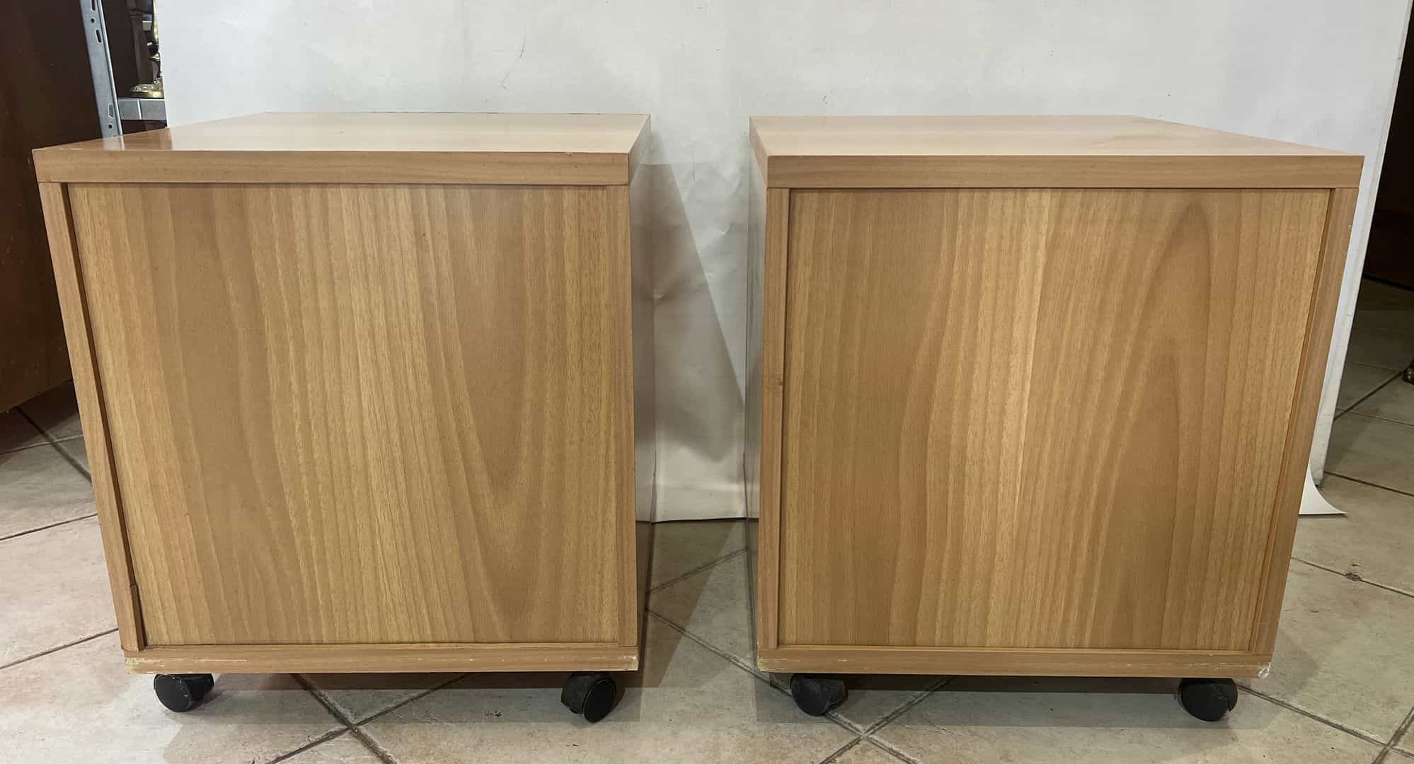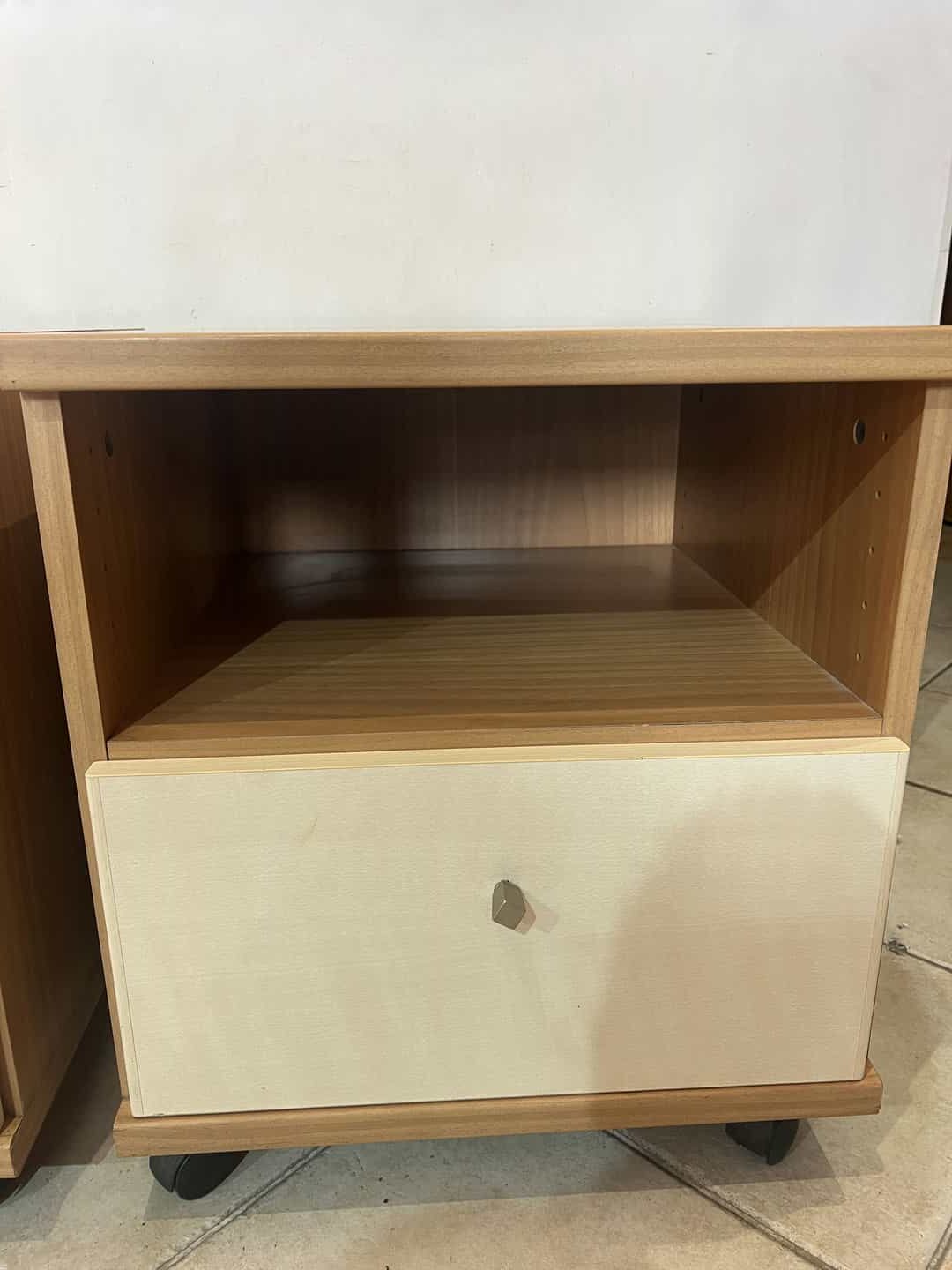 Σετ 2 κομοδίνα με συρτάρι και ροδάκια 53×46,5×49 Υπάρχουν μικρές φθορές, τα πόμολα είναι διαφορετικά Κωδικός προϊόντος: #s16430