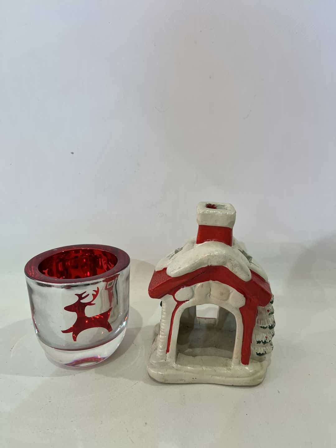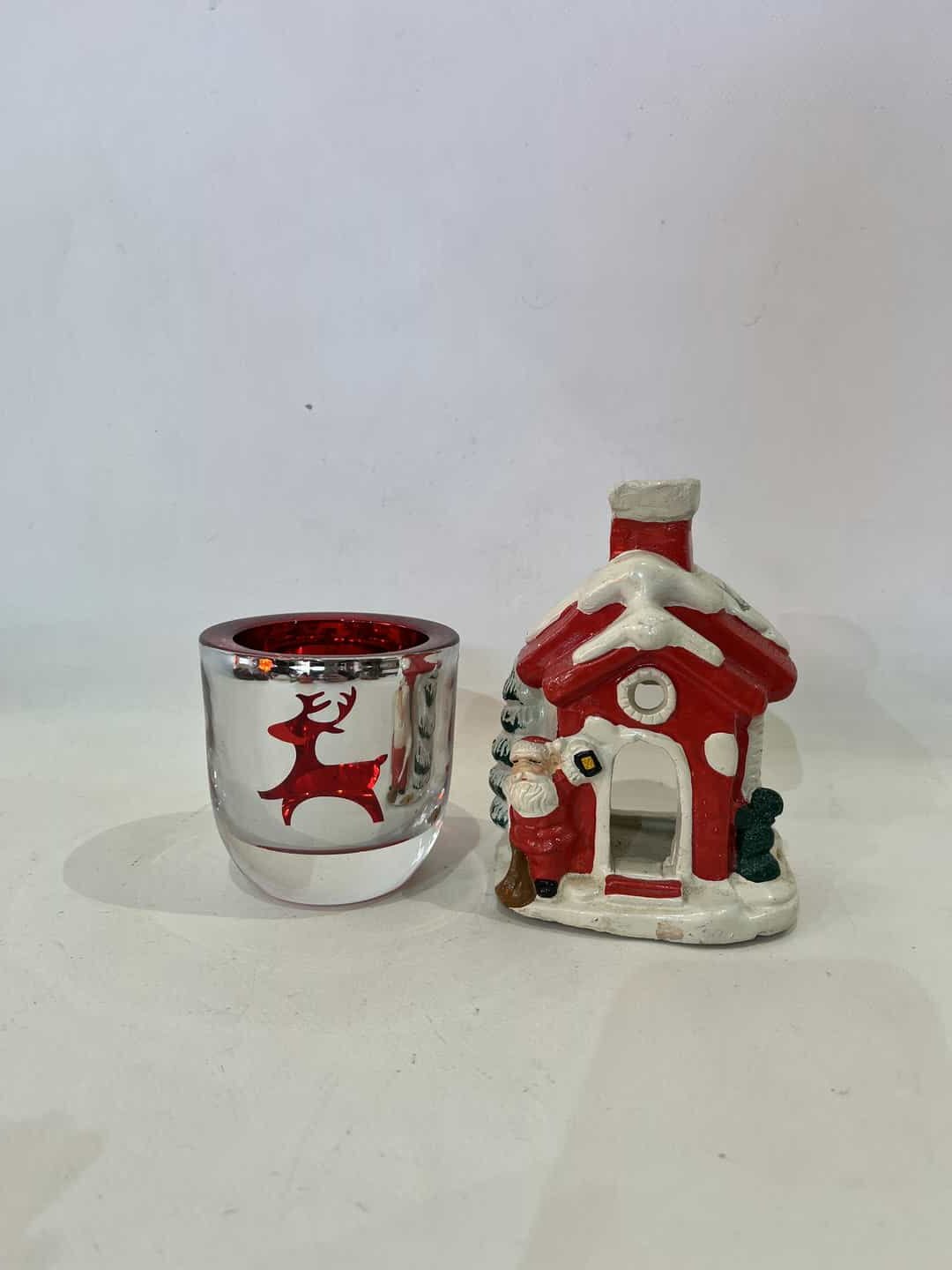 Σετ 2 Χριστουγεννιάτικα κηροπήγια. Διαστάσεις σπιτιού: 13x9x7 , γυάλινου με ελαφάκια: 8×8  Κωδικός προϊόντος: #s15272