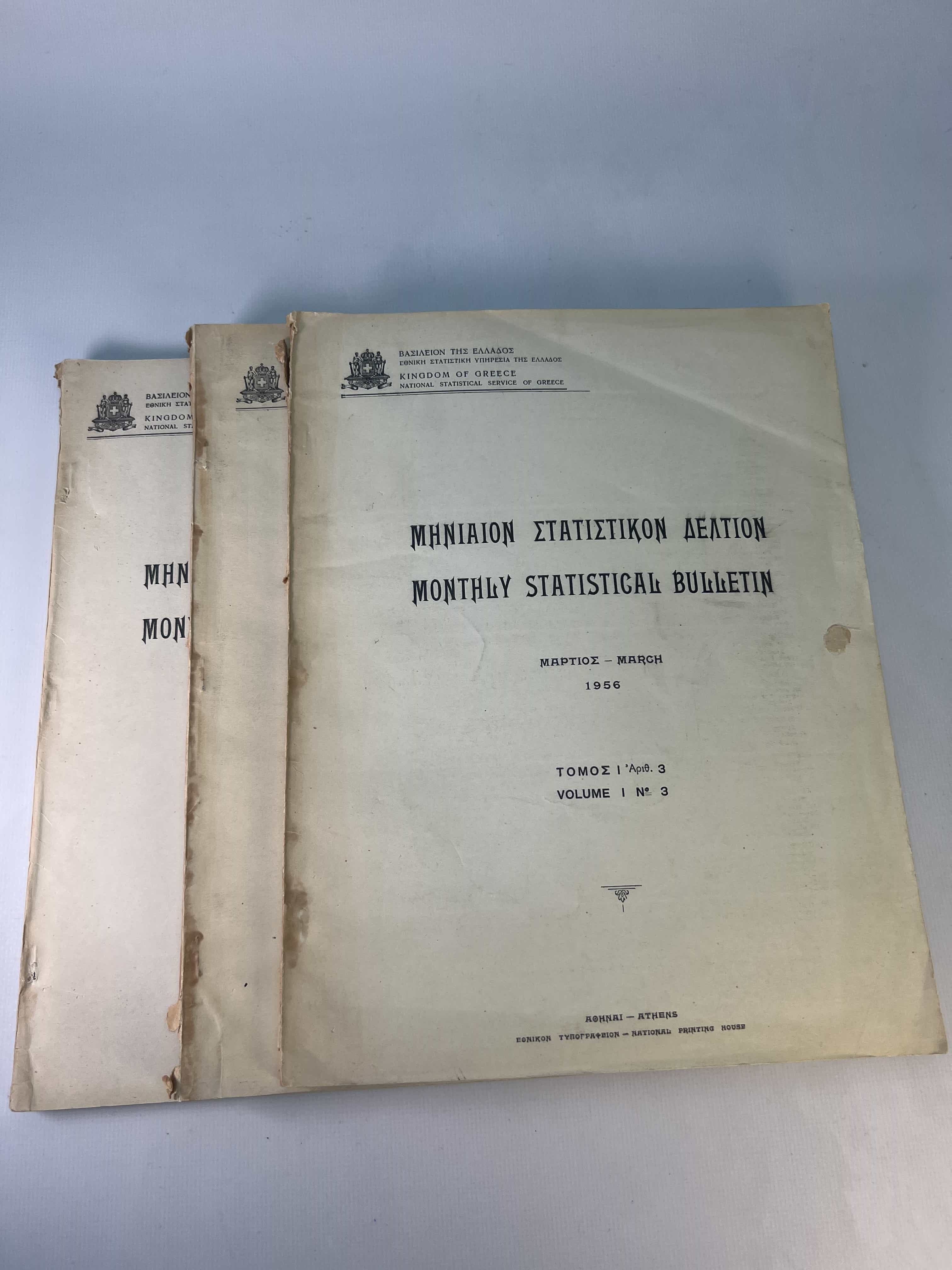 Σετ 3 Μηνιαίον Στατιστικόν Δελτίον  1956,Αρθ.1-2 Ιανουάριος Φεβρουάριος 1956 – Αρθ.3 Μάρτιος 1956 – Αρθ.5 Μάιος 1956 Κωδικός Προϊόντος: #s0706