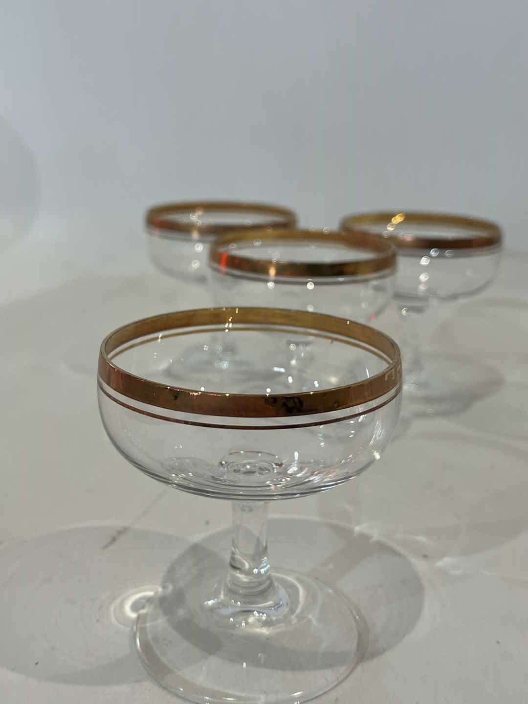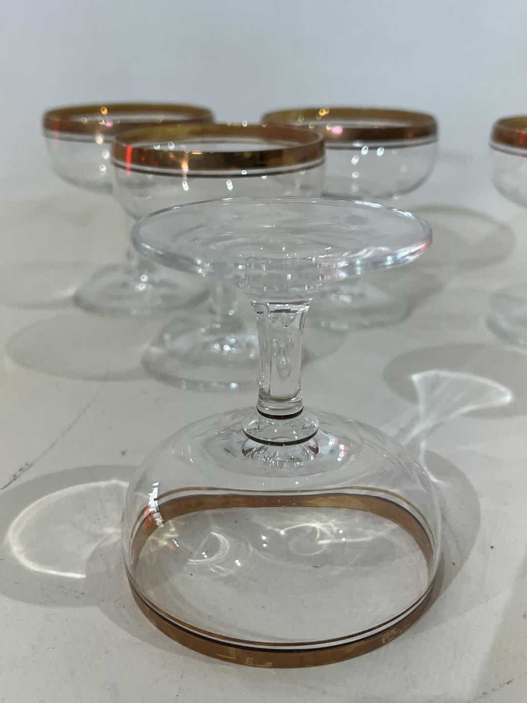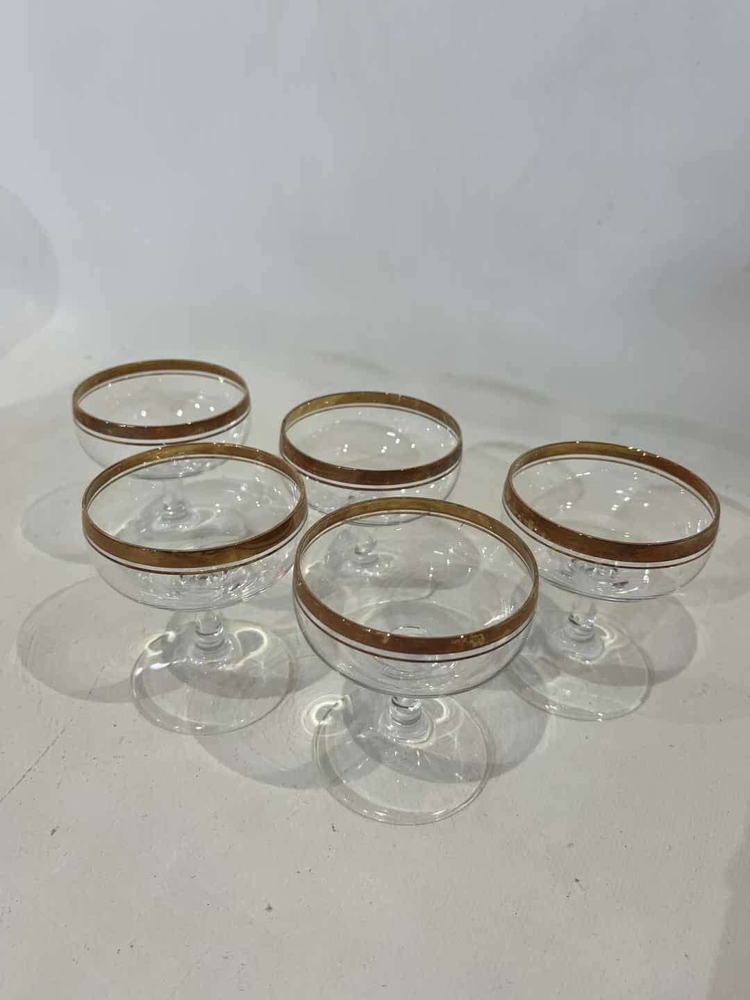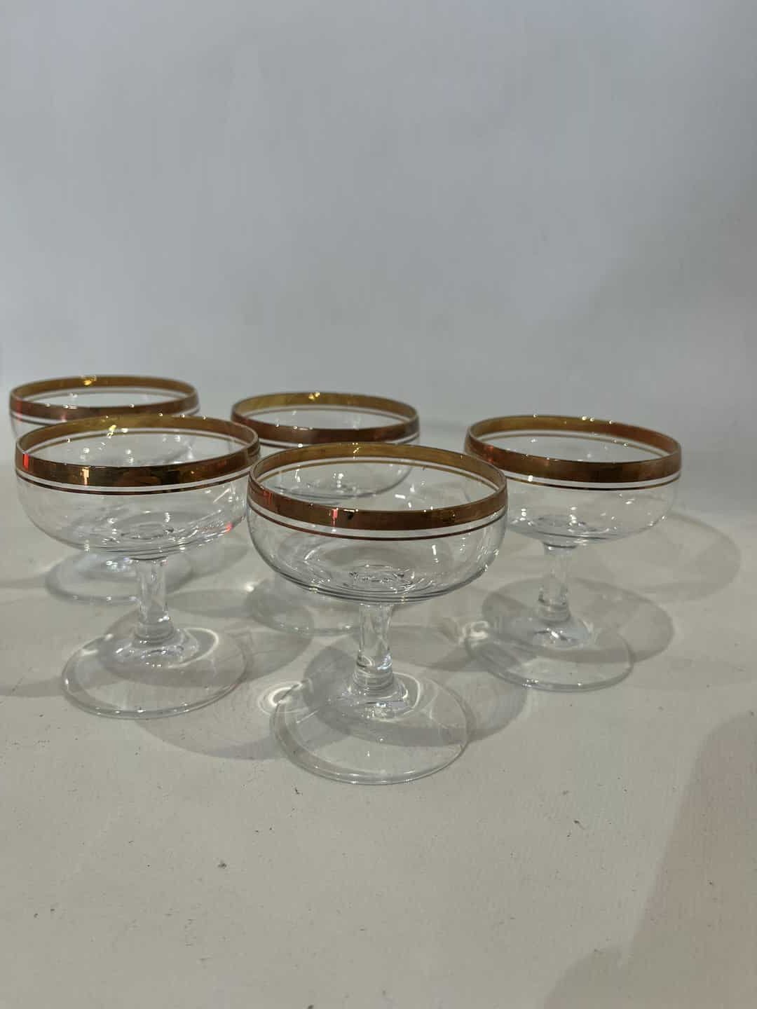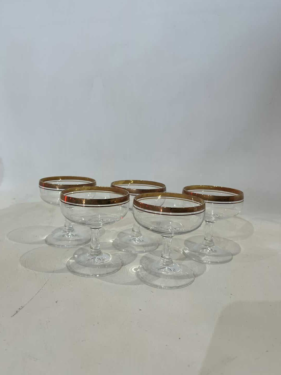 Σετ 5 γυάλινα ποτήρια σαμπάνιας με χρυσό σχέδιο 8×6 . Υπάρχει ελάχιστη φθορά στο χρώμα τους Κωδικός προϊόντος: #s15124