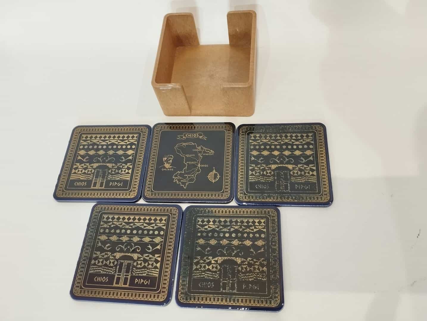 Σετ 5 διακοσμητικά κεραμικά σουβέρ-Χίος 8,5×8,5 με ξύλινη θήκη