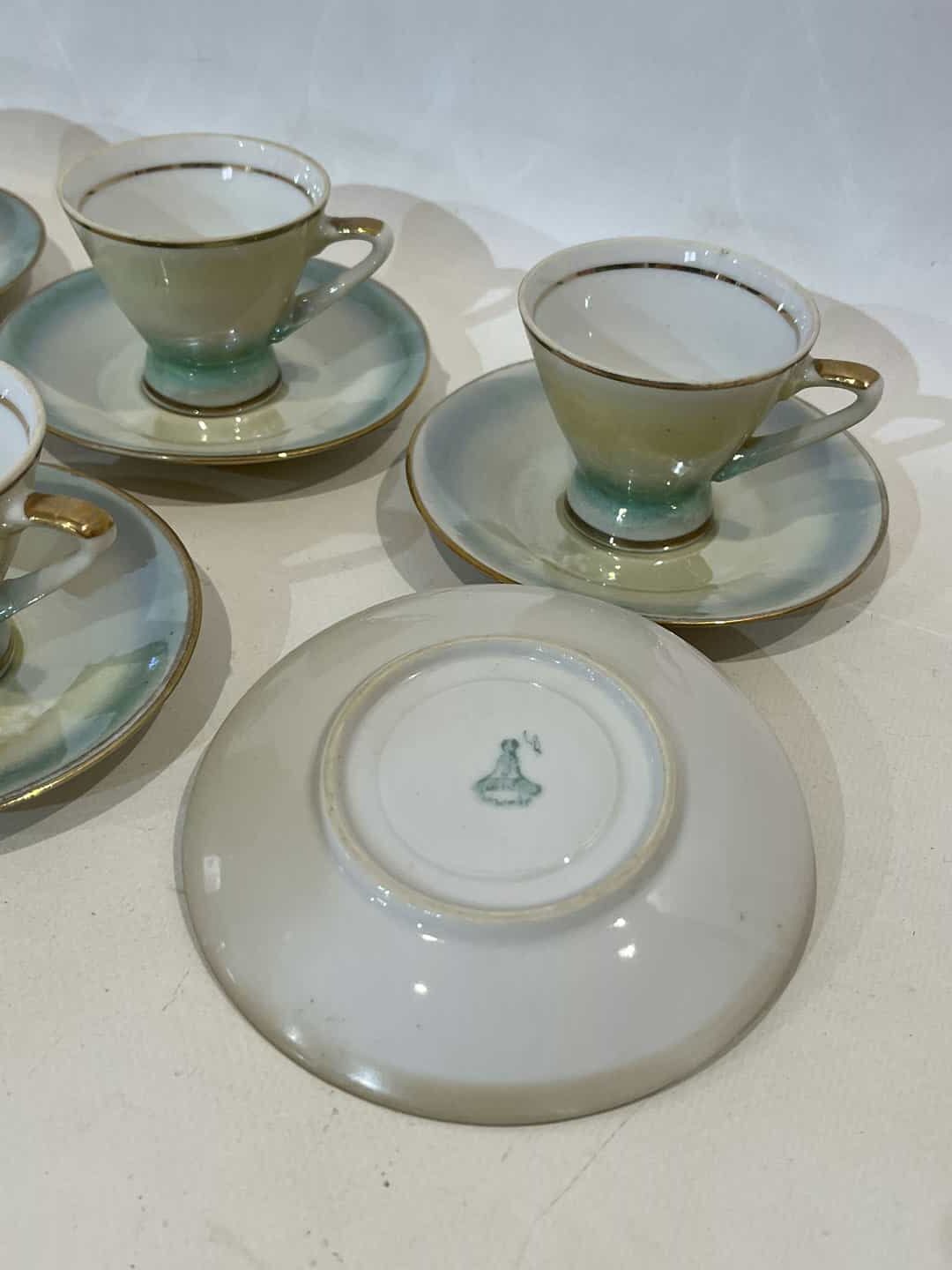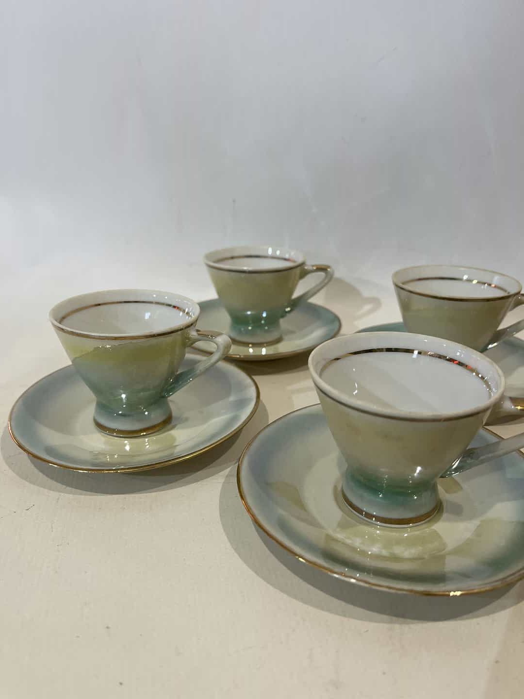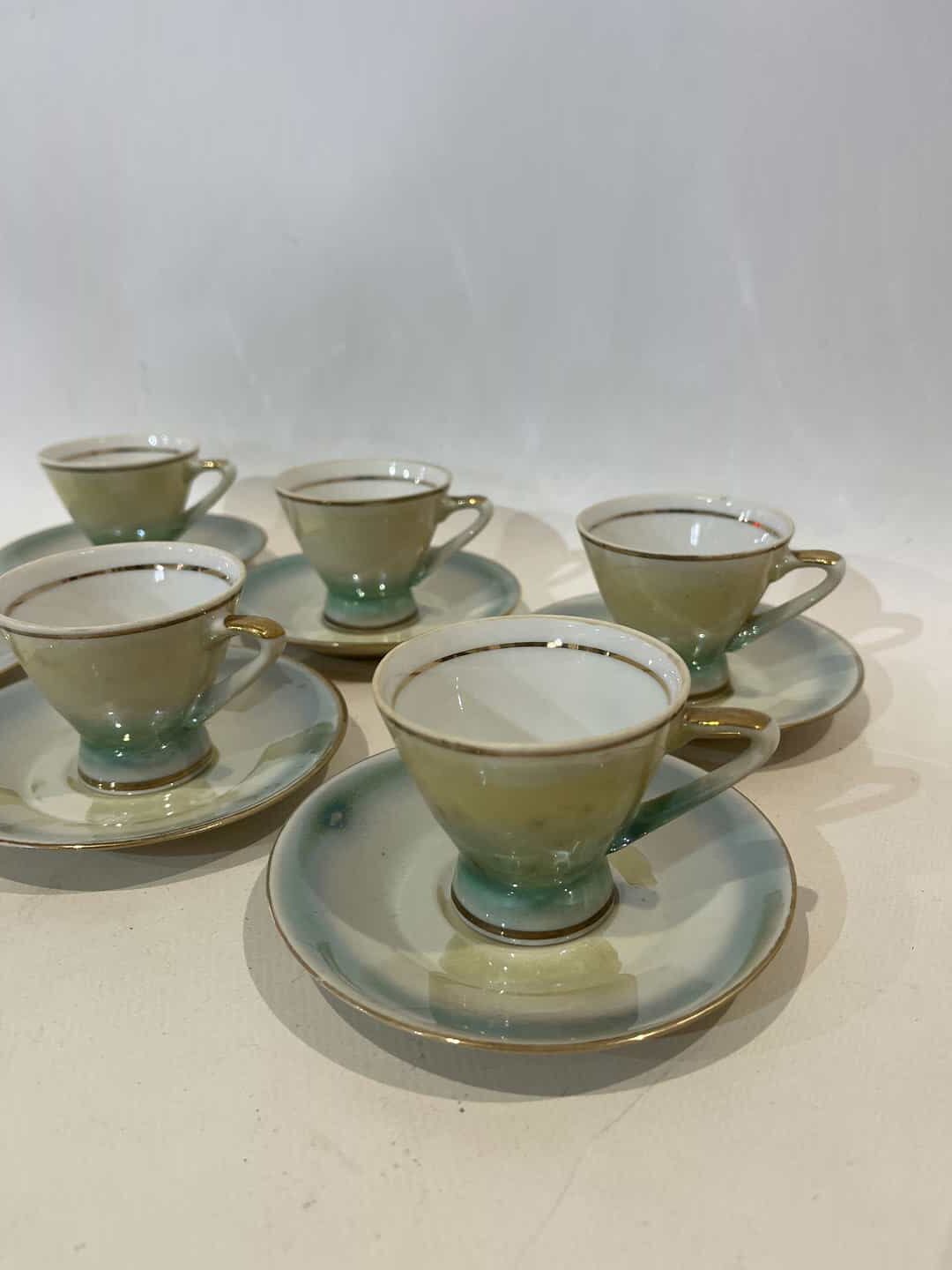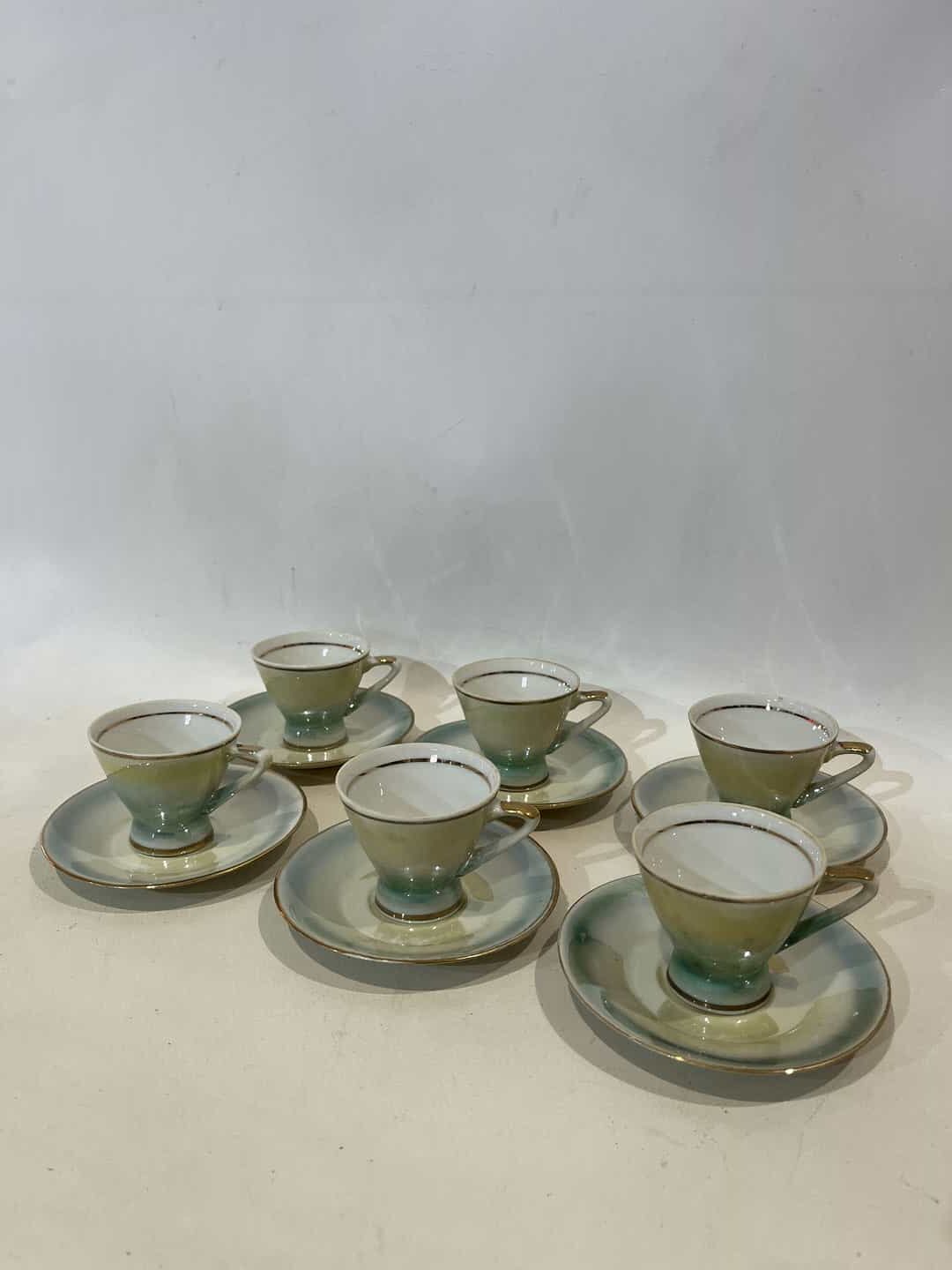 Σετ 6 πορσελάνινα φλιτζανάκια του καφέ με πιατάκια Mid Century σε μπλε/πράσινο χρώμα. Διαστάσεις πιατάκι: 11cm , φλιτζανάκι: 5x8x6 . Το χρώμα τους είναι λίφο ξεθοριασμένο Κωδικός προϊόντος: #s15677