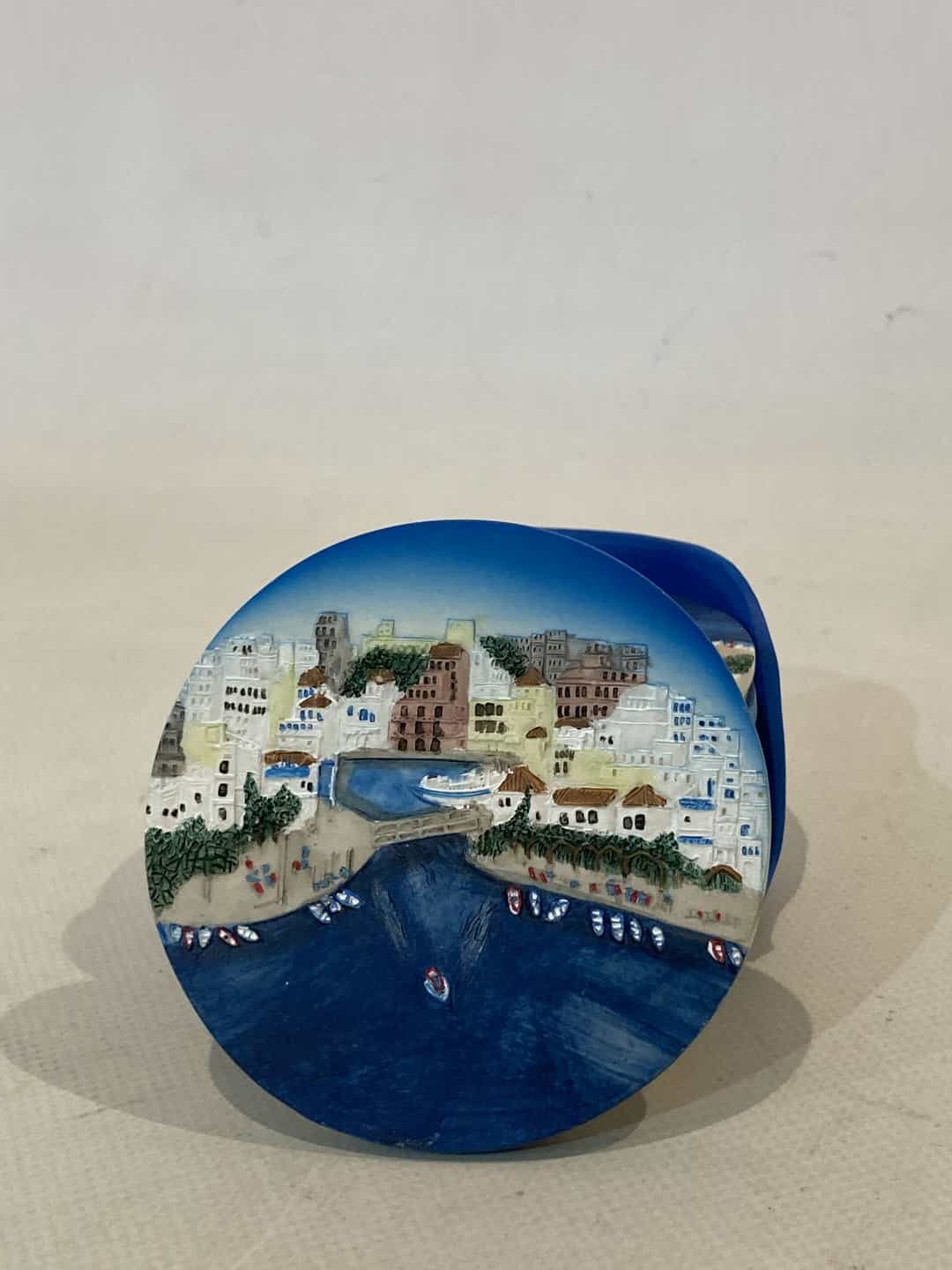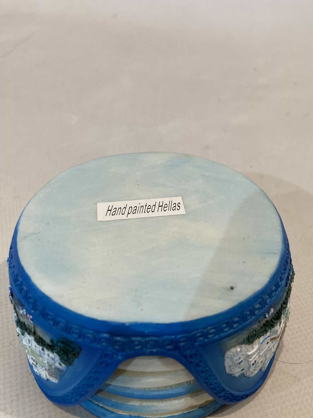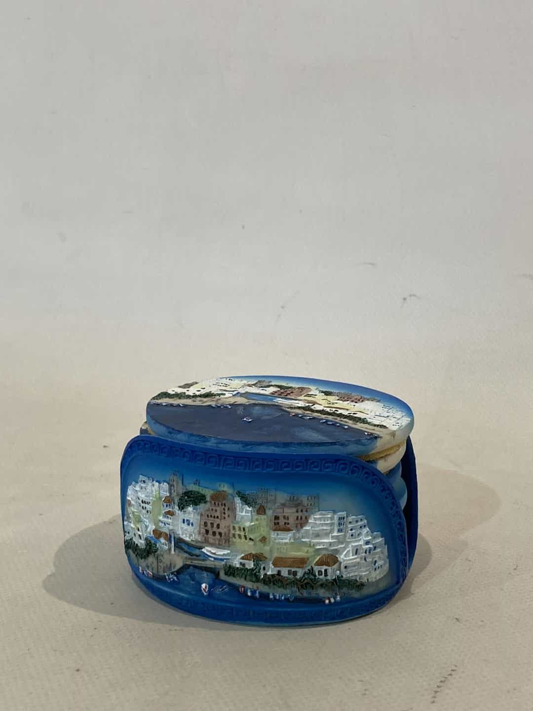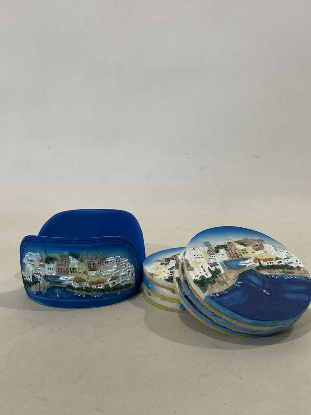 Σετ 6 vintage σουβέρ αναμνηστικά, με απεικόνιση από Ελληνικό νησί, ζωγραφισμένα στο χέρι με ανάγλυφα σχέδια 6x10x8,5 Κωδικός προϊόντος: #s9777