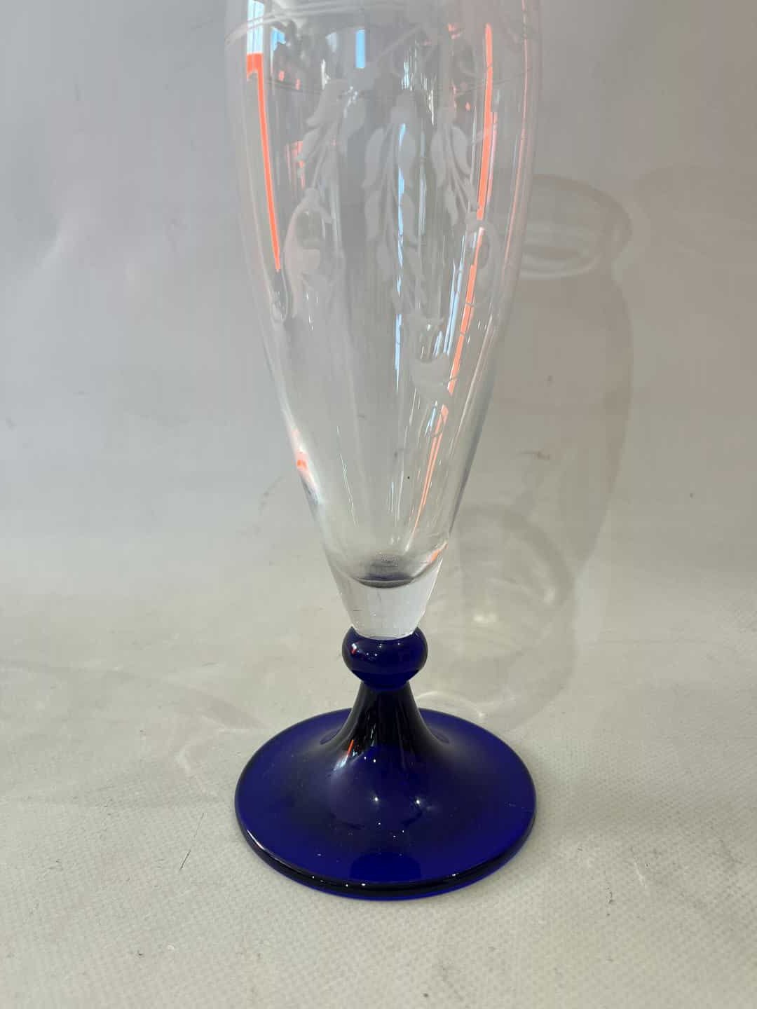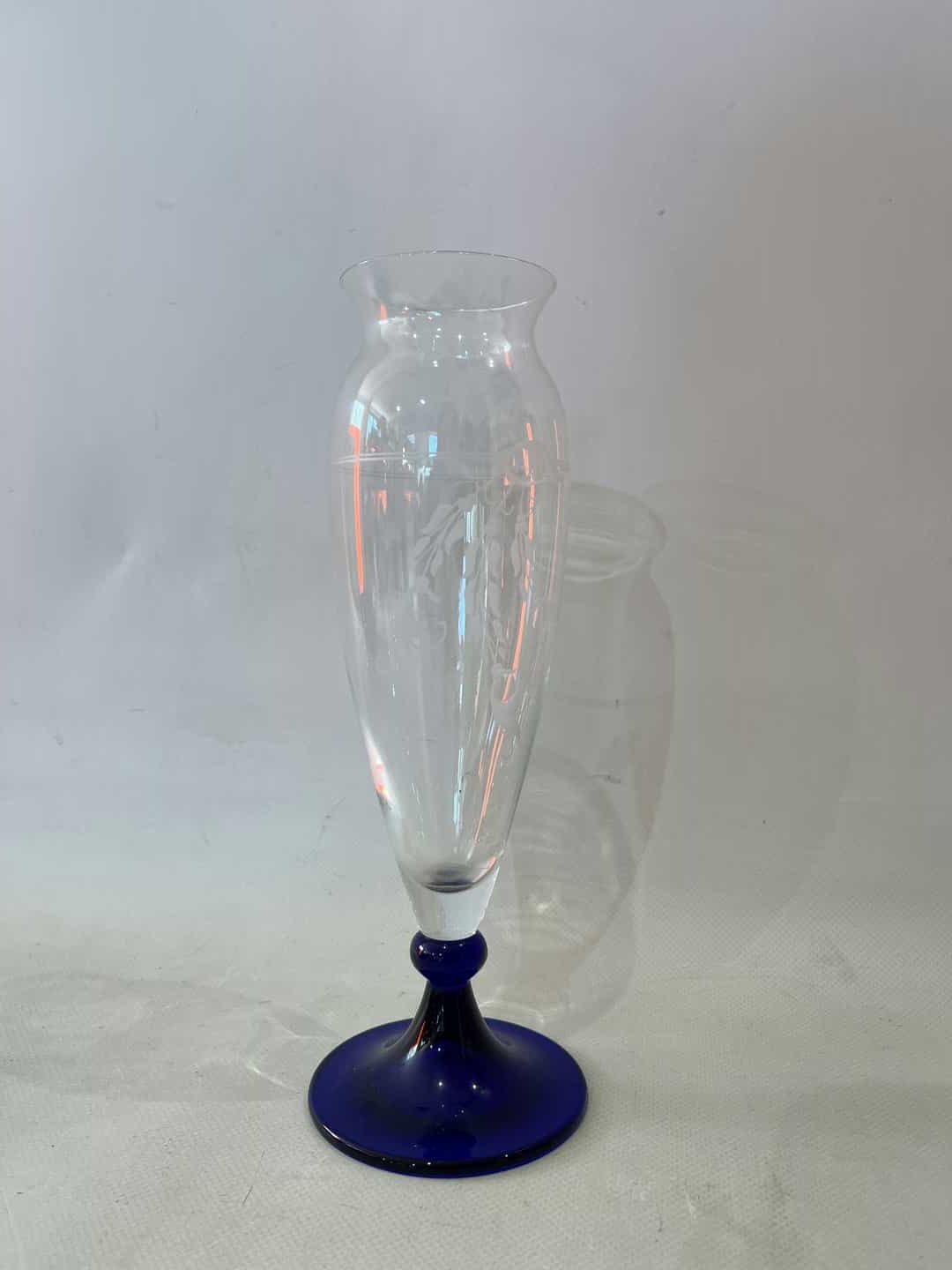 Vintage γυάλινο βάζο με μπλε βάση και εγχάρακτα σχέδια 26×7