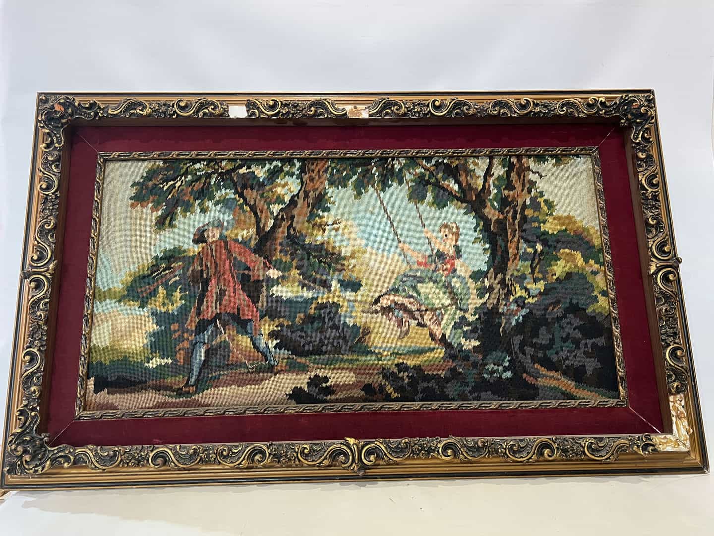 Vintage κεντητός πίνακας Swing με κορνίζα 75,5×126 Υπάρχει φθορά στην κορνίζα και δεν έχει τζάμι Κωδικός προϊόντος: #s15466