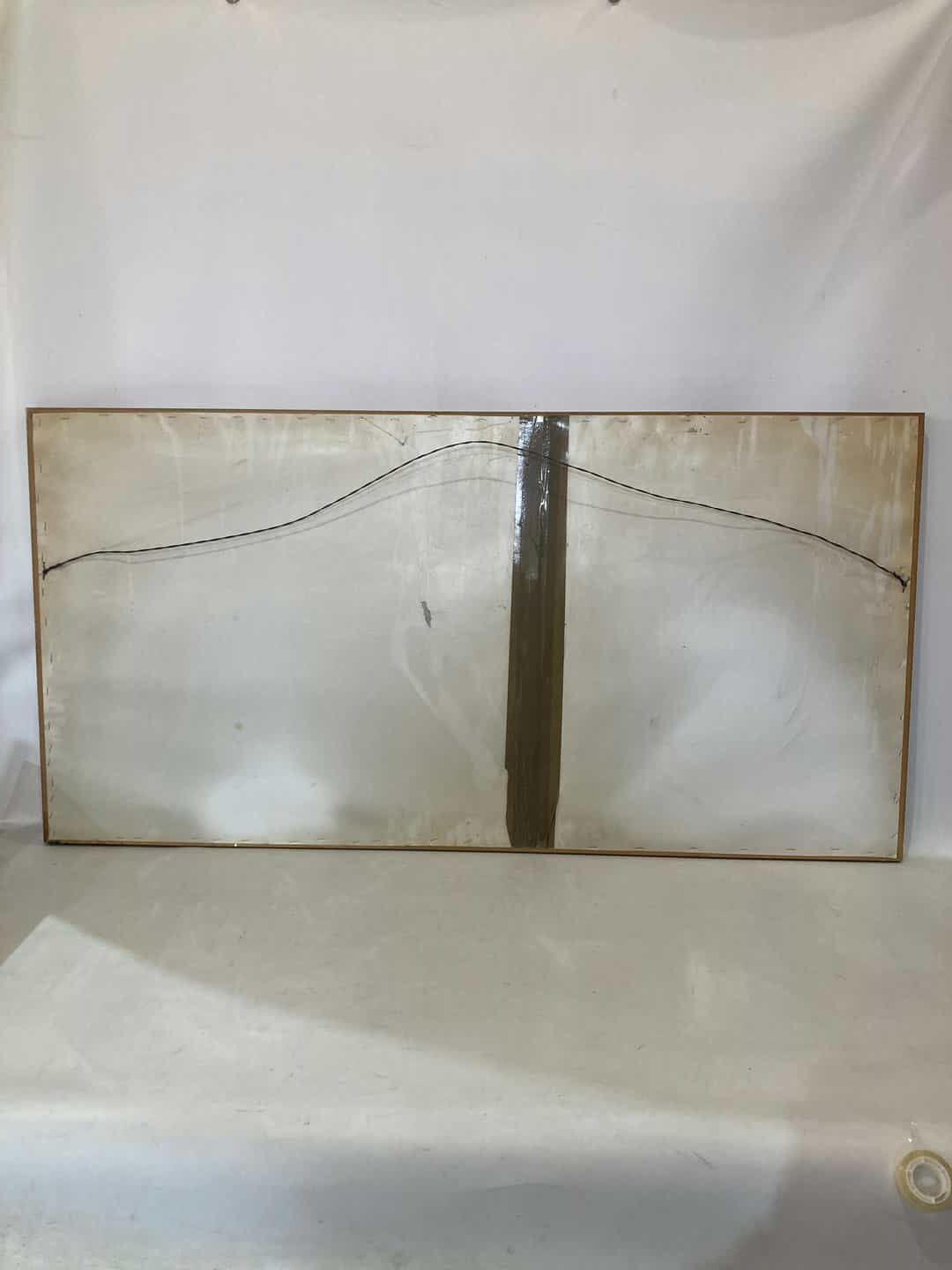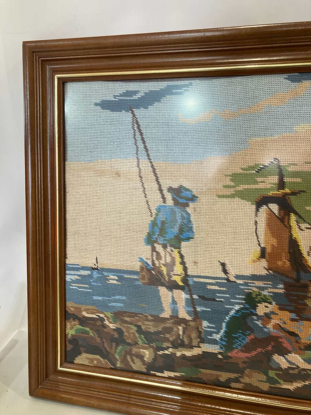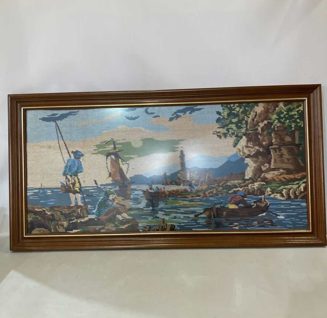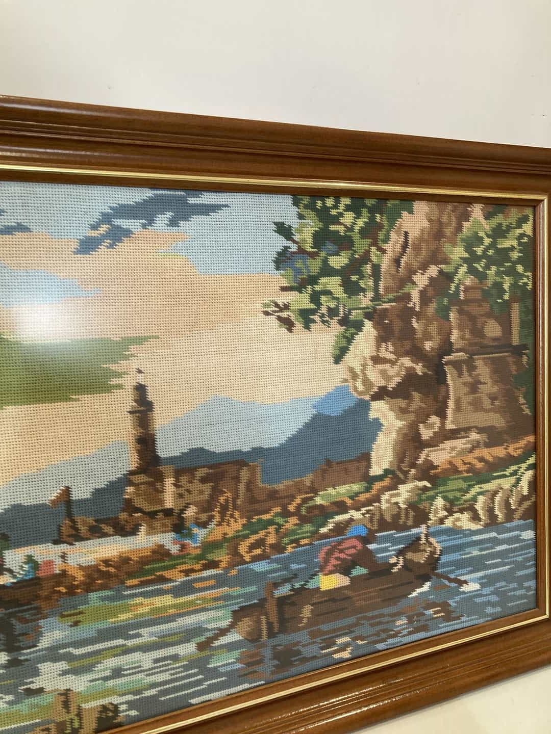 Vintage κεντητό κάδρο τοίχου με ξύλινη κορνίζα και χρυσές λεπτομέρειες 63×124