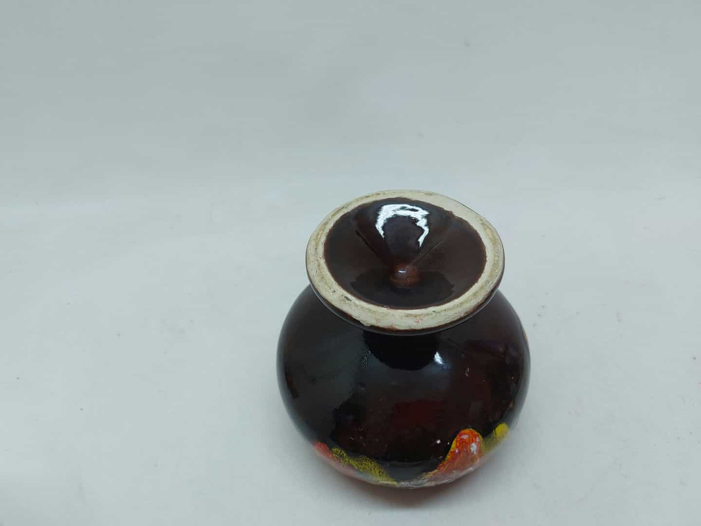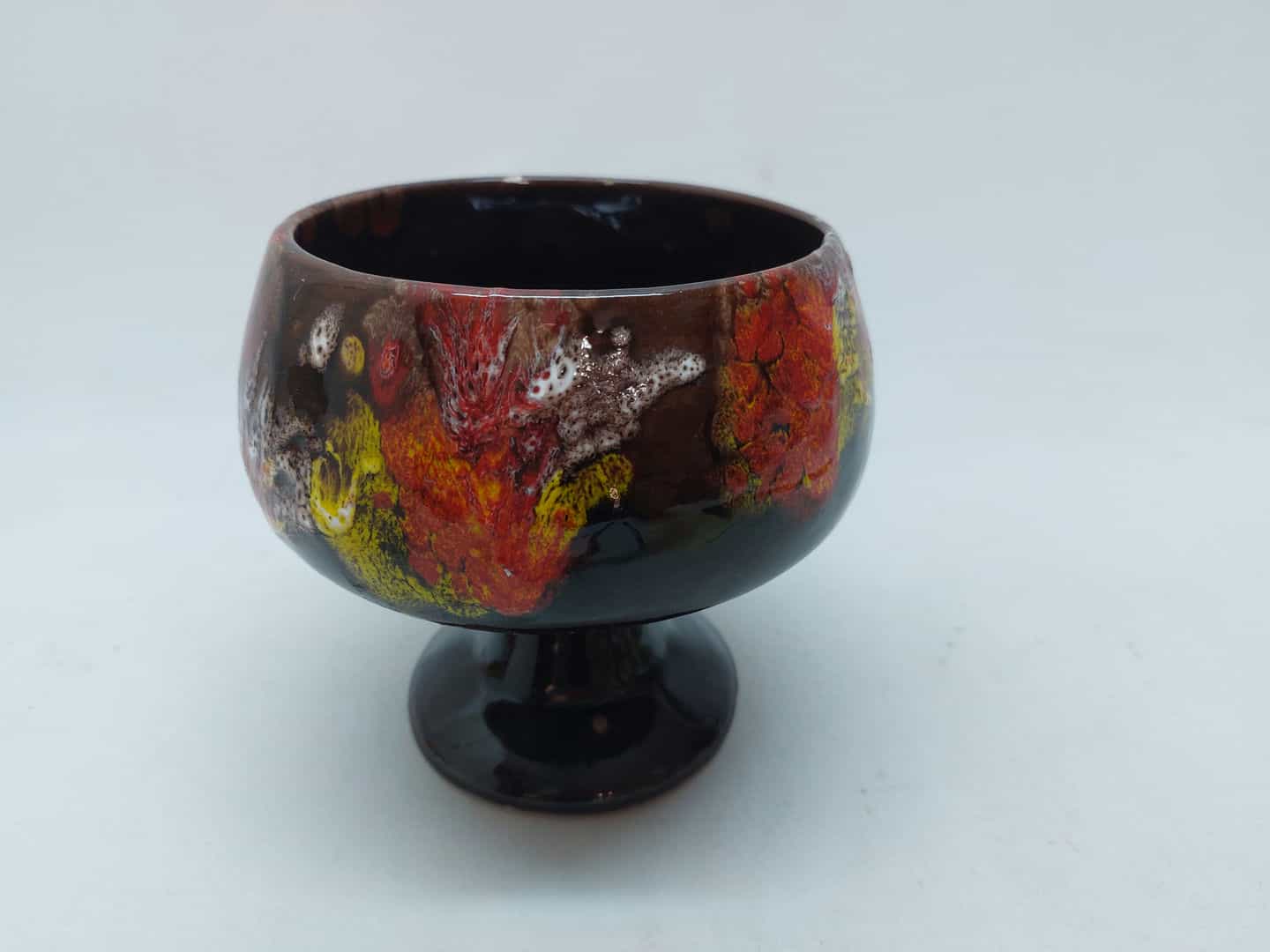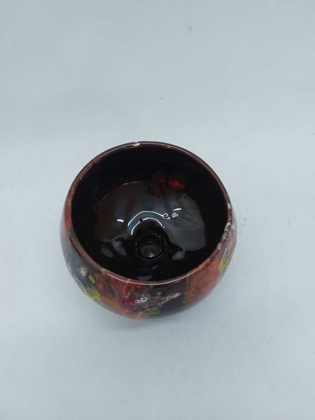 Vintage κεραμική φοντανιέρα με ποδαράκι σε σκούρη καφέ απόχρωση και πολύχρωμα σχέδια 13x11cm Κωδικός προϊόντος:#s4809