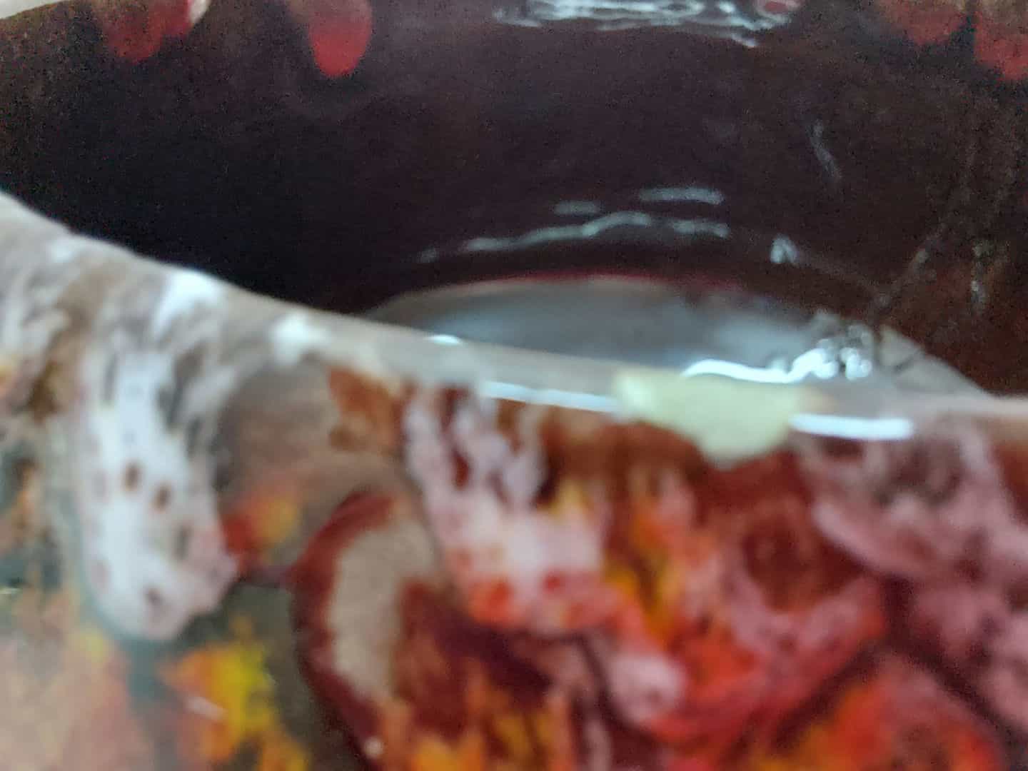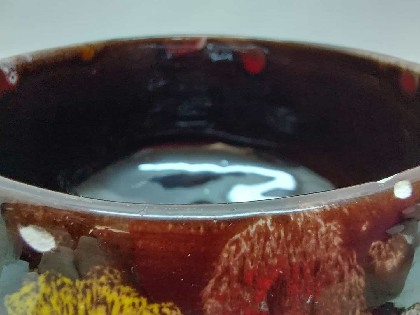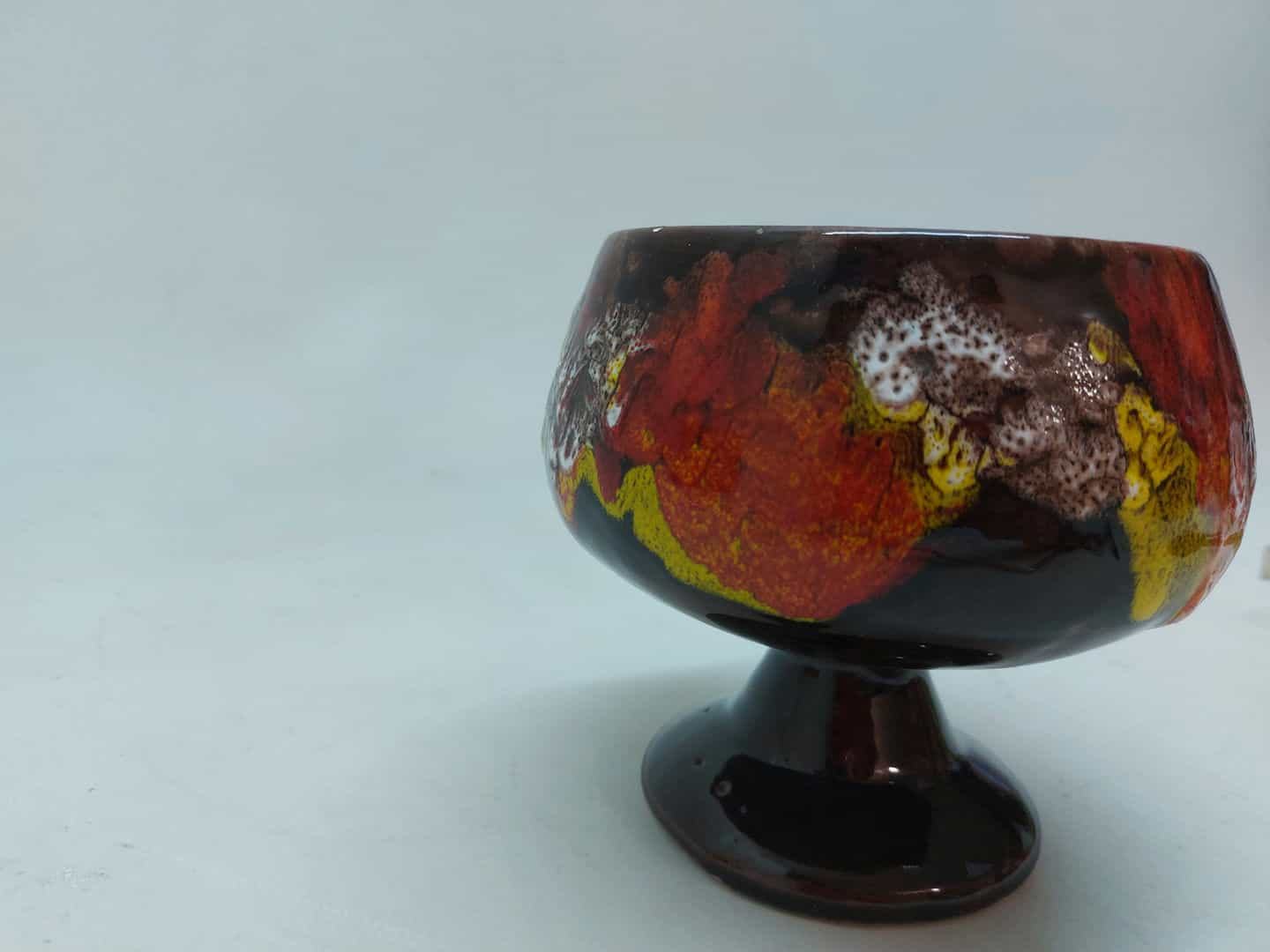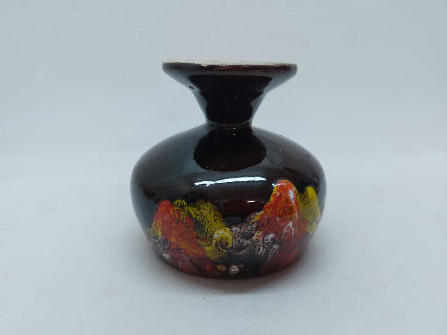 Vintage κεραμική φοντανιέρα με ποδαράκι σε σκούρη καφέ απόχρωση και πολύχρωμα σχέδια 13x11cm Κωδικός προϊόντος:#s4809