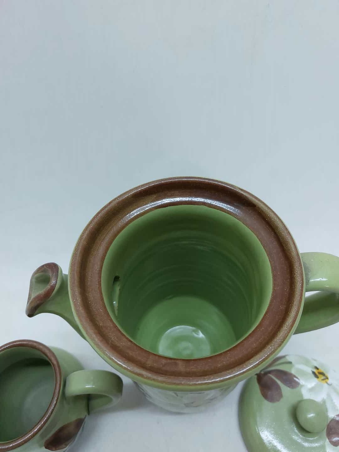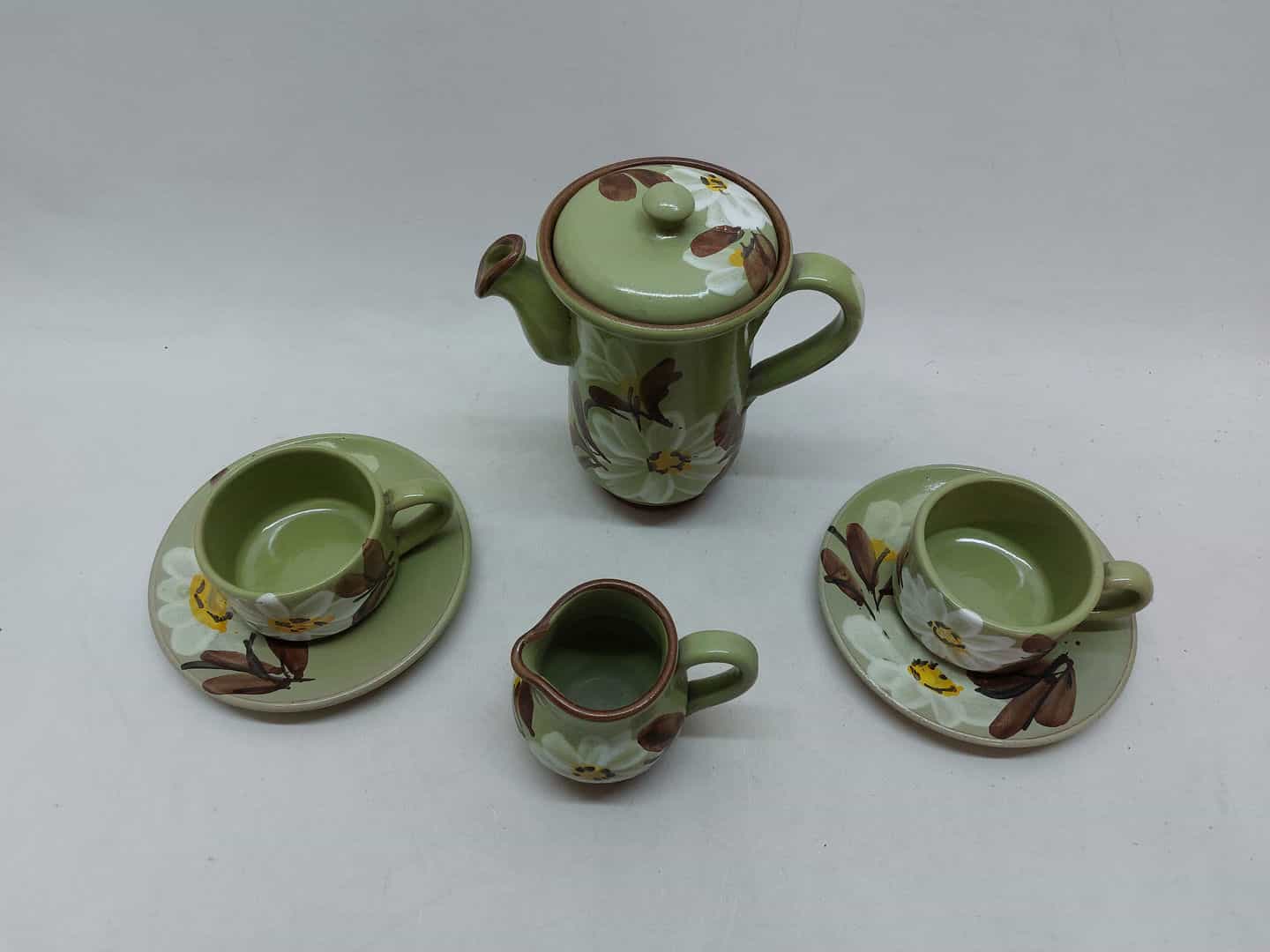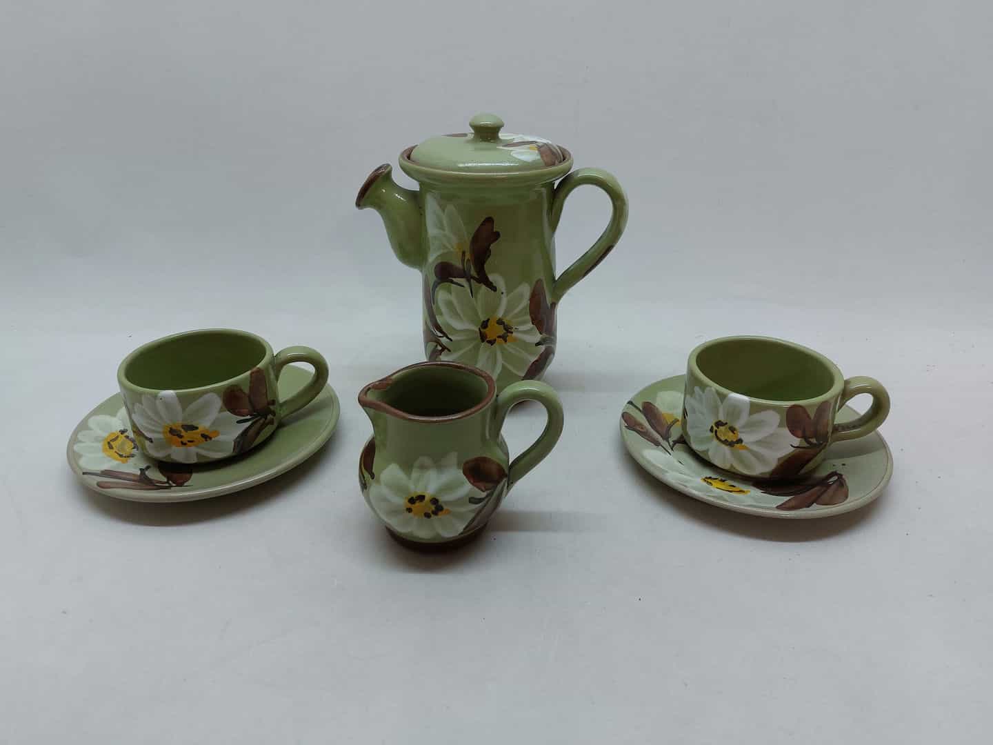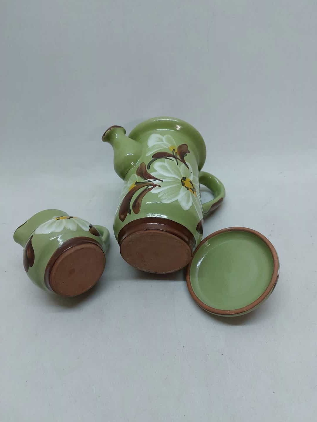 Vintage κεραμικό σετ τσαγιού/καφέ 4 τεμαχίων σε πράσινο χρώμα με λουλούδια. Αποτελείται από 2 φλιτζάνια 6x12x9cm/πιατάκια 16,5cm, 1 τσαγιέρα/καφετιέρα 21x19x11,5cm και 1 γαλατιέρα 9x11x8cm (με μικρό ελάττωμα, όπως φαίνεται στην φωτογραφία) Κωδικός προϊόντος: #s6913