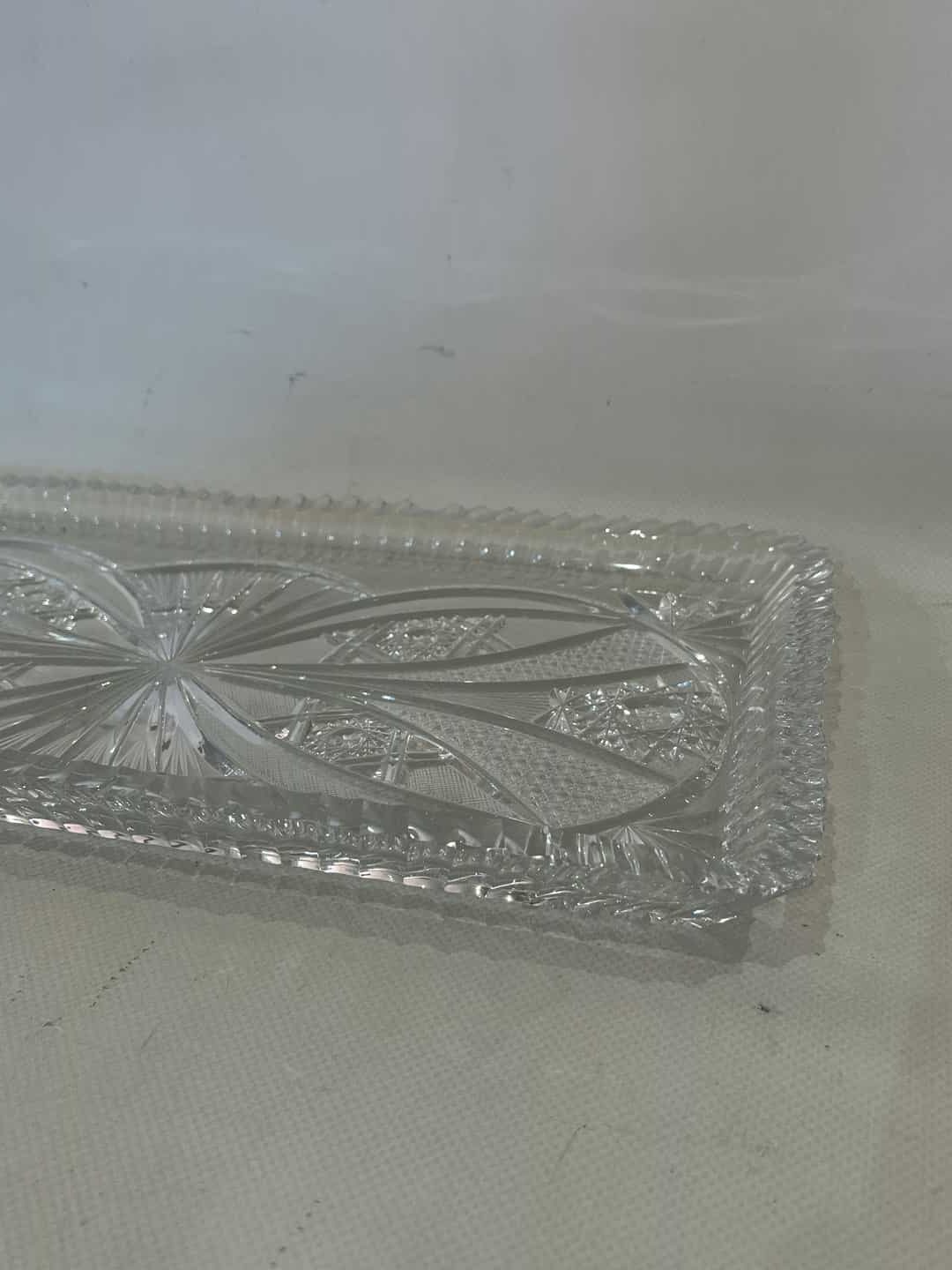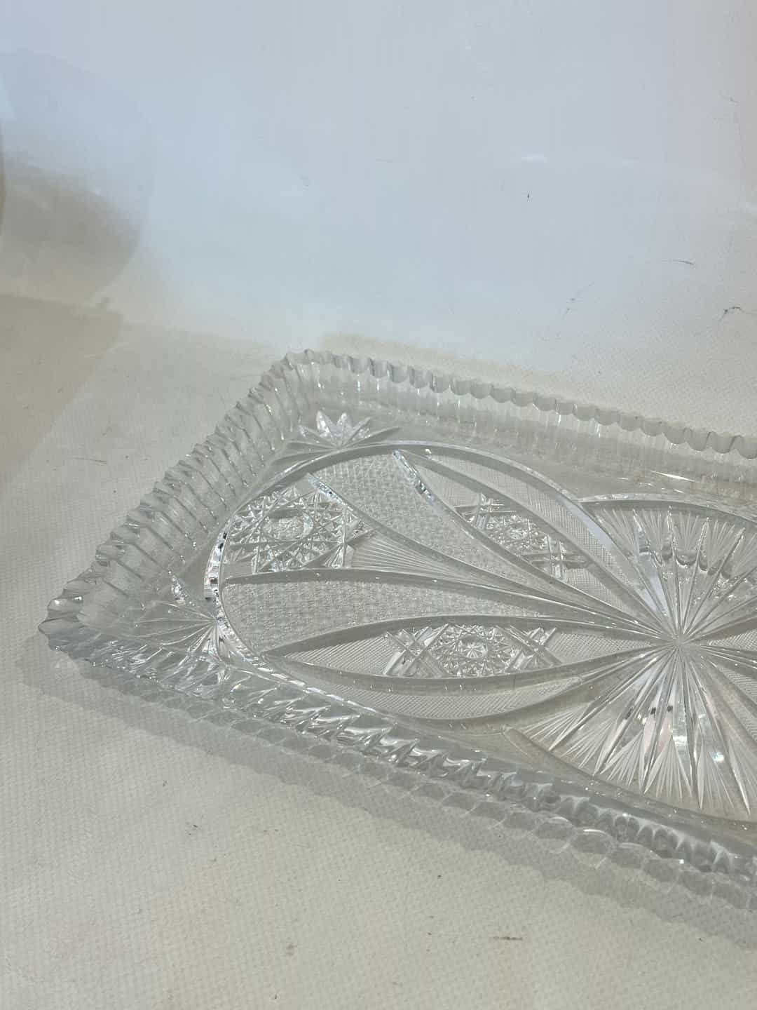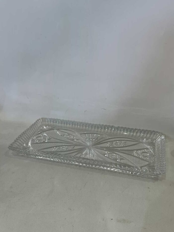 Vintage κρυστάλλινη πιατέλα σερβιρίσματος με ανάγλυφα σχέδια 3x39x20.Έχει ένα μικρό σπάσιμο  Κωδικός προϊόντος: #s9445