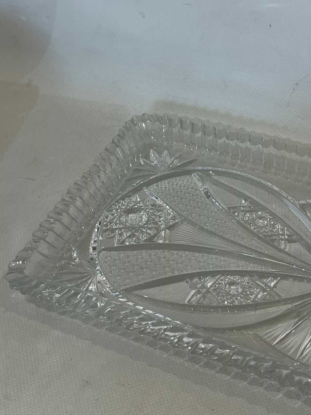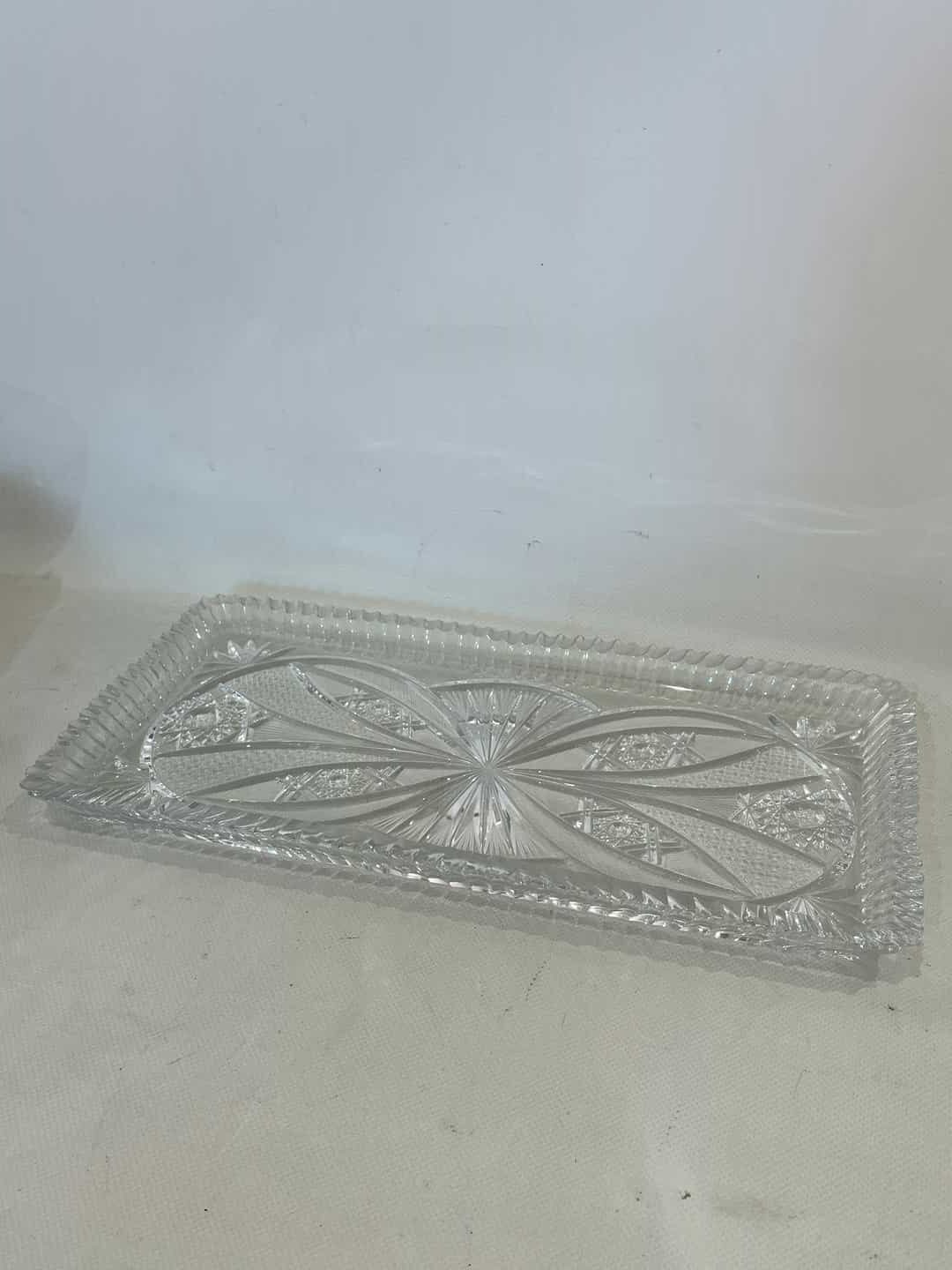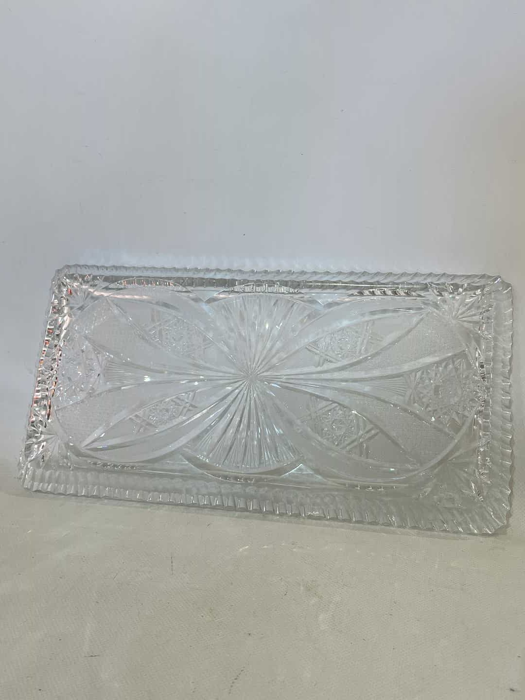 Vintage κρυστάλλινη πιατέλα σερβιρίσματος με ανάγλυφα σχέδια 3x39x20.Έχει ένα μικρό σπάσιμο  Κωδικός προϊόντος: #s9445