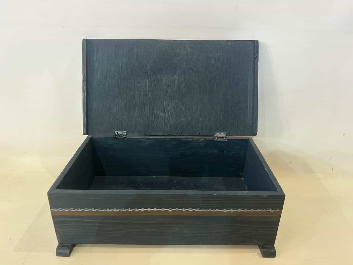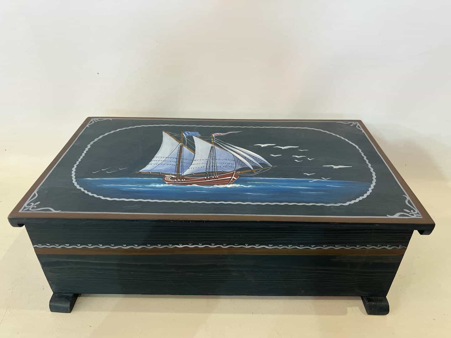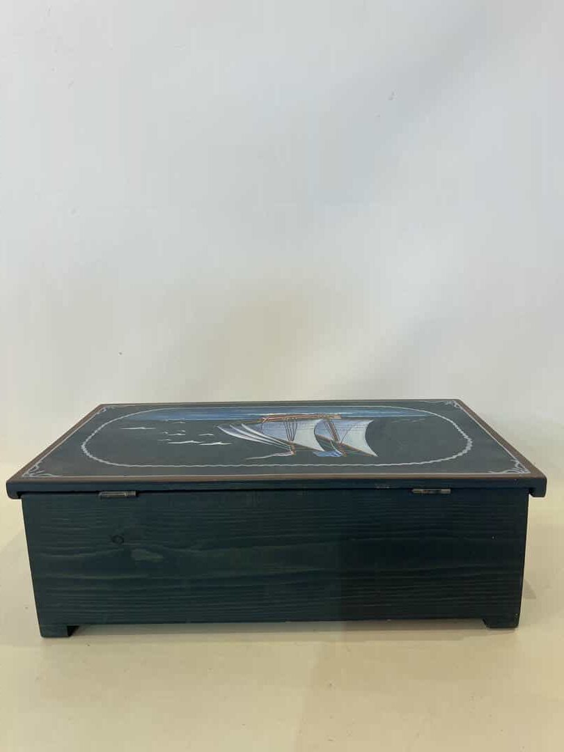 Vintage ξύλινο κουτί αποθήκευσης με ζωφραφιστό πλοίο 12x37x20,5
