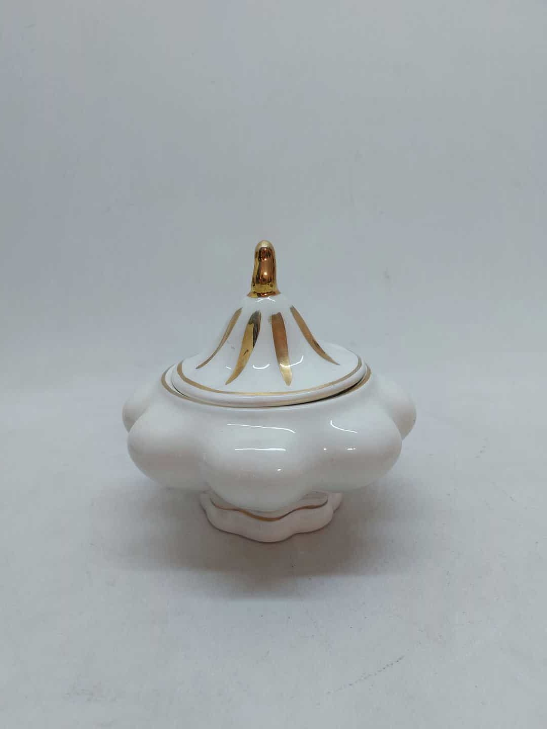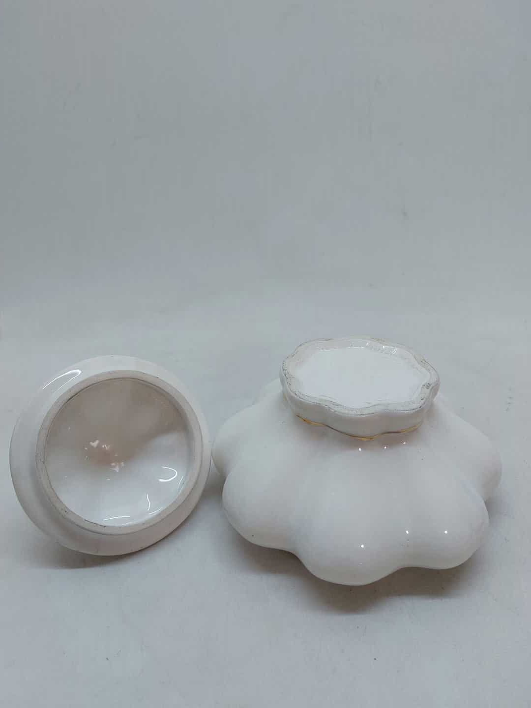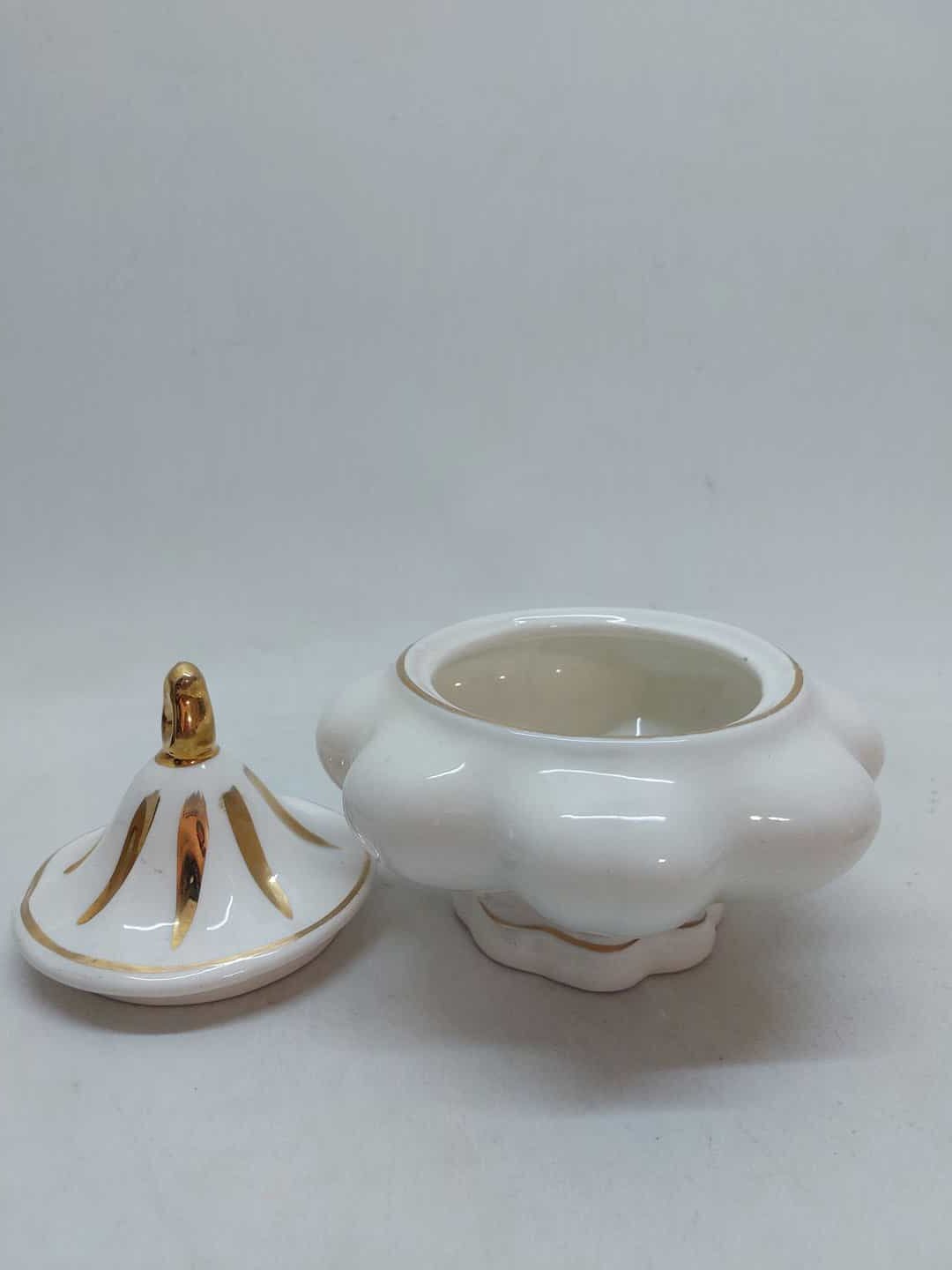 Vintage πορσελάνινη φοντανιέρα με καπάκι σε λευκό χρώμα με χρυσές λεπτομέρειες 16,5×16,5cm