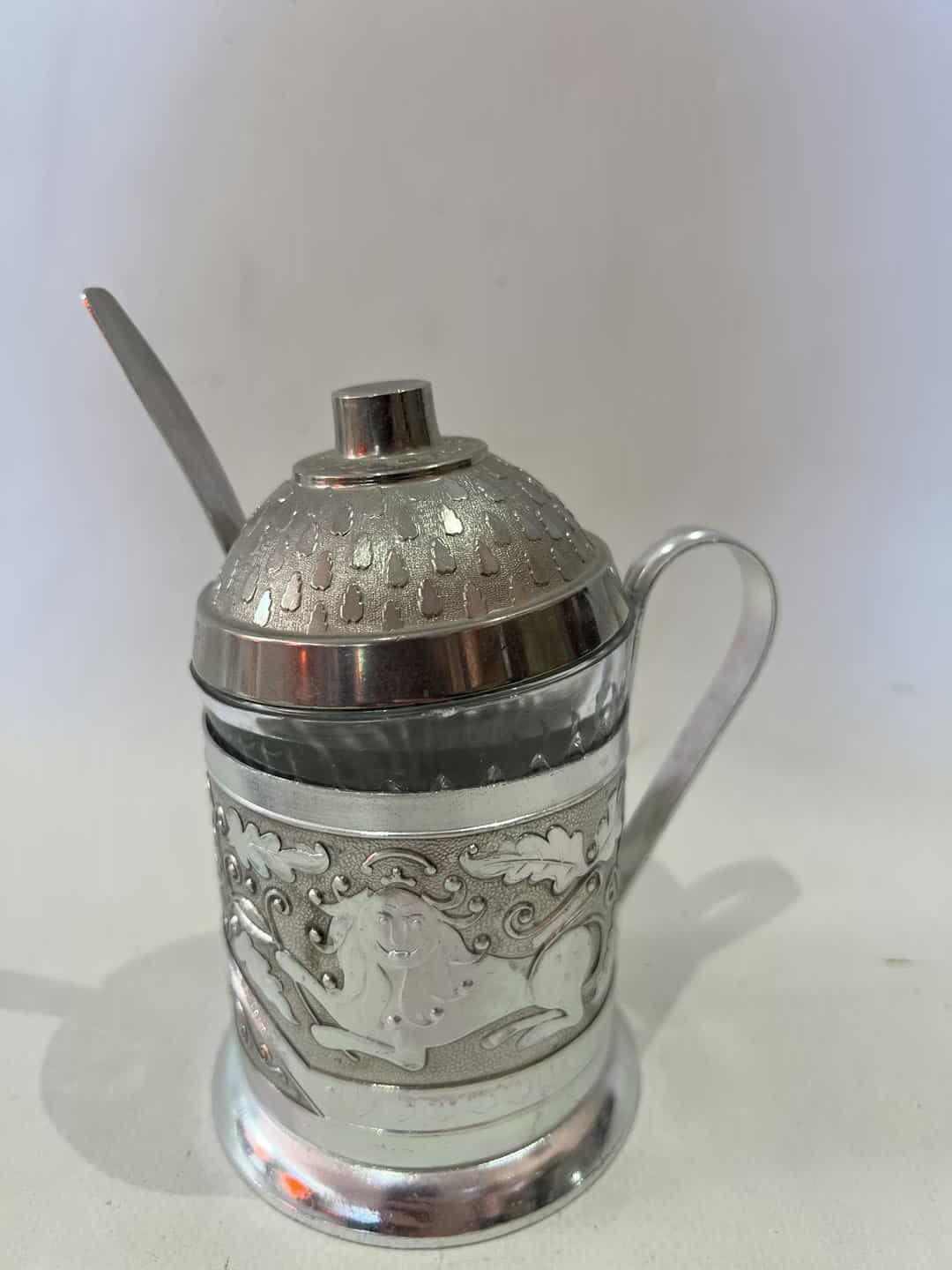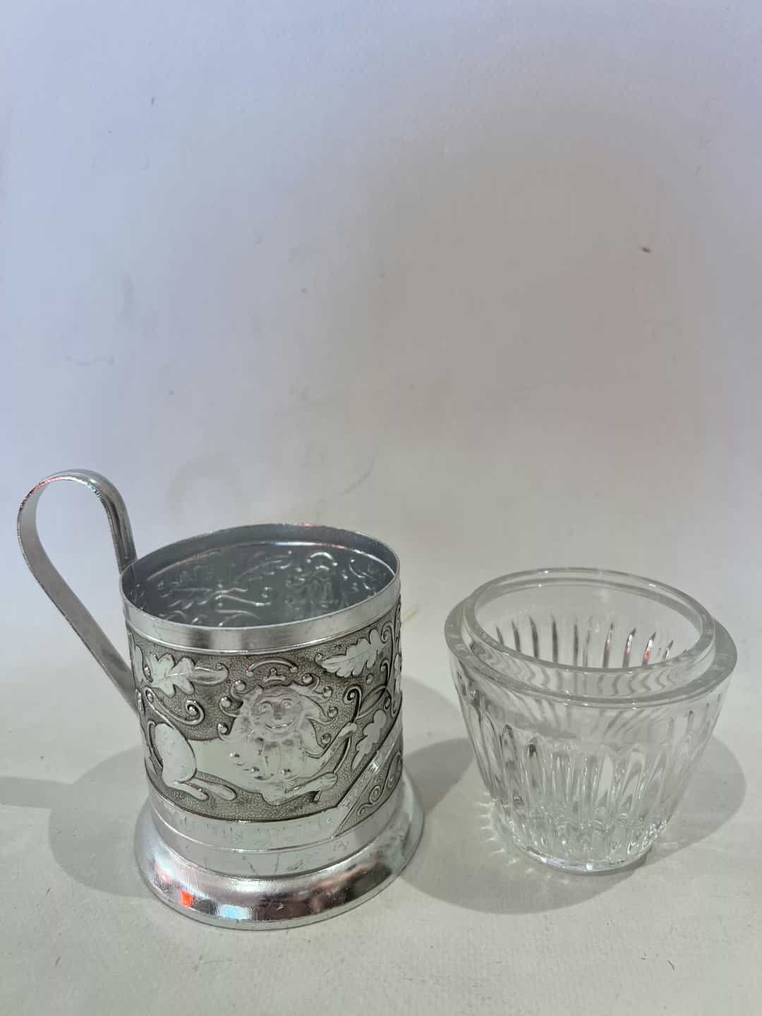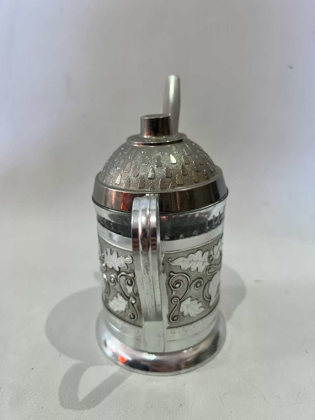 Vintage υποστύρωμα ποτηριού με ενσωματωμένο γυάλινο ποτήρι και καπάκι 12,5x10x8 Υπάρχει ράγισμα στο ποτήρι  Κωδικός προϊόντος: #s16843