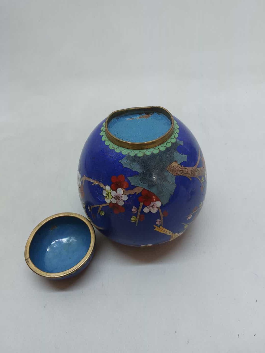 Vintage χειροποίητο κινέζικο βάζο με καπάκι και ξύλινη σκαλιστή βάση. Διαστάσεις: βάζο 19x15x6,5cm και βάση 3x8cm. Υπάρχουν μικρές ατέλειες στο εσωτερικό του βάζου και στο κάτω μέρος υπάρχει ελάττωμα και είναι λίγο ζουλιγμένο. Υπάρχει και μια πολύ μικρή ατέλεια στο εσωτερικό μέρος από το καπάκι Κωδικός προϊόντος: #s8970